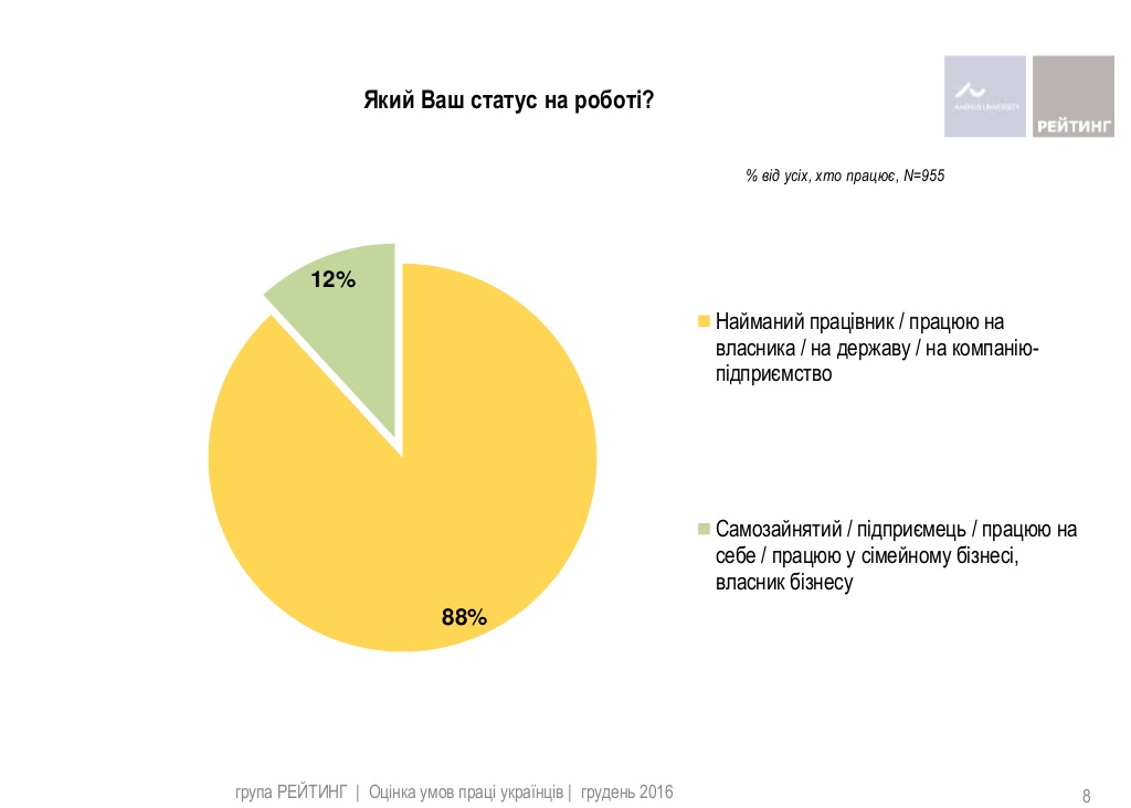 88% з тих, хто працює, - наймані працівники, 12% - самозайняті (підприємці, які працюють в сімейному бізнесі тощо).