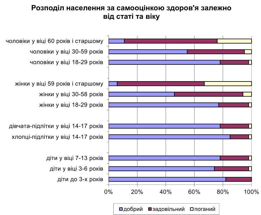 На "поганий" стан здоров'я вказали 10% опитаних. Найбільша частка населення, яке погано себе почувало, спостерігалася серед осіб непрацездатного віку: так оцінили стан свого здоров'я кожна третя жінка та кожен четвертий чоловік.
