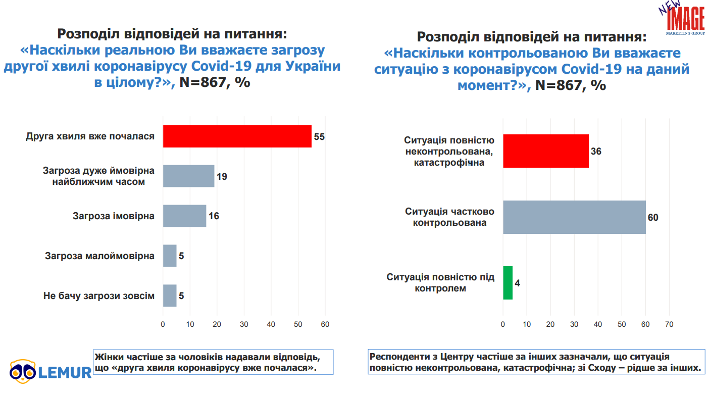 Понад третина українців (36%) вважають ситуацію з коронавірусом COVID-19 неконтрольованою, катастрофічною на даний момент. Про це свідчать результати опитування, проведеного New Image Marketing Group упродовж 13-15 жовтня.