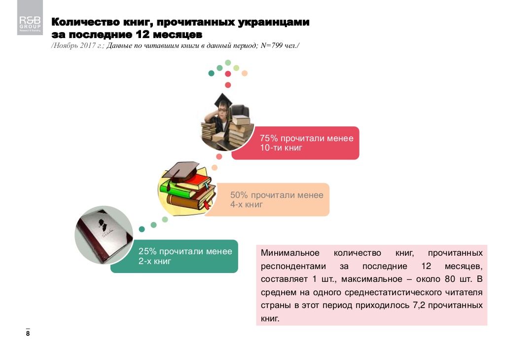 Як свідчать дані опитування, проведеного компанією Research & Branding Group у жовтні-листопаді 2017 року, менше половини українців (43%) за останній рік прочитали хоча б одну якусь книгу. Більшість опитаних заявили, що протягом аналізованого періоду вони або взагалі не прочитали жодної книги (51%), або не змогли відповісти, чи читали вони що-небудь чи ні (6%).