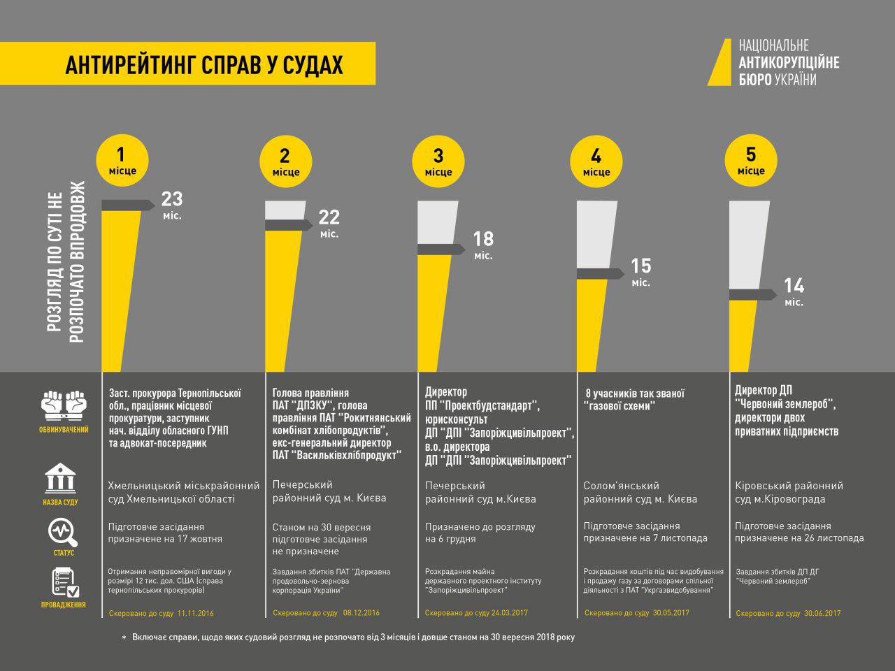 "Так звана "справа тернопільських прокурорів" за обвинуваченням посадовців в отриманні неправомірної вигоди вже 22 місяці перебуває у судових інстанціях, а її розгляд по суті досі не розпочато. Схожа ситуація з провадженням за фактом завдання збитків "Державній продовольчо-зерновій корпорації України". Засідання не може відбутися з грудня 2016 року", - зазначають у НАБУ.