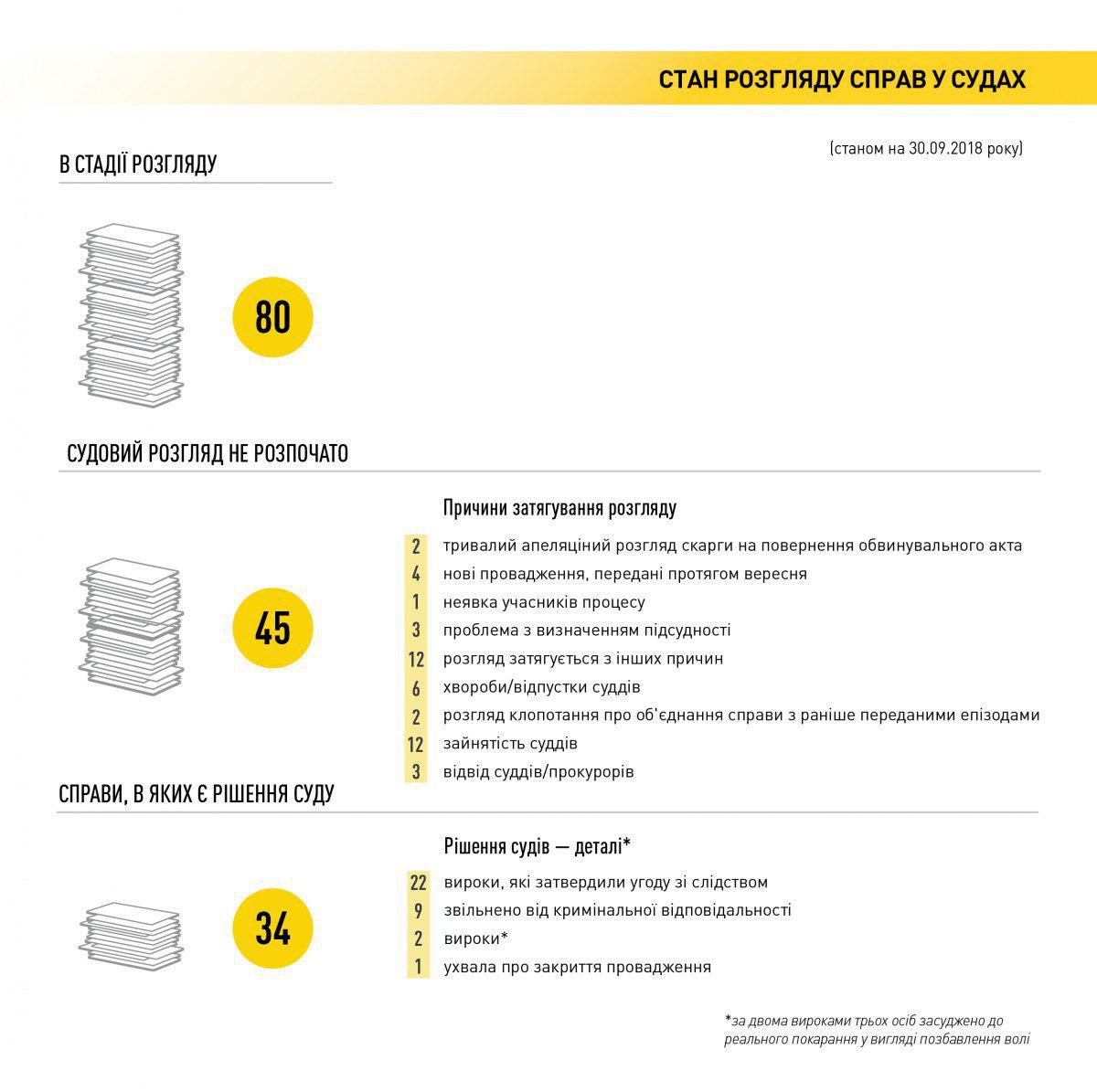 Судові рішення винесені у 34 кримінальних провадженнях, розслідуванням яких займались антикорупційні органи, проте лише трьох підозрюваних засуджено до покарання у вигляді позбавлення волі.