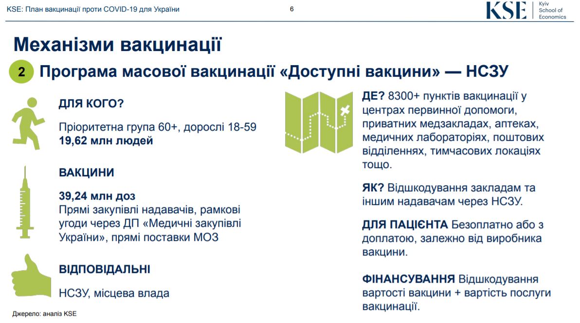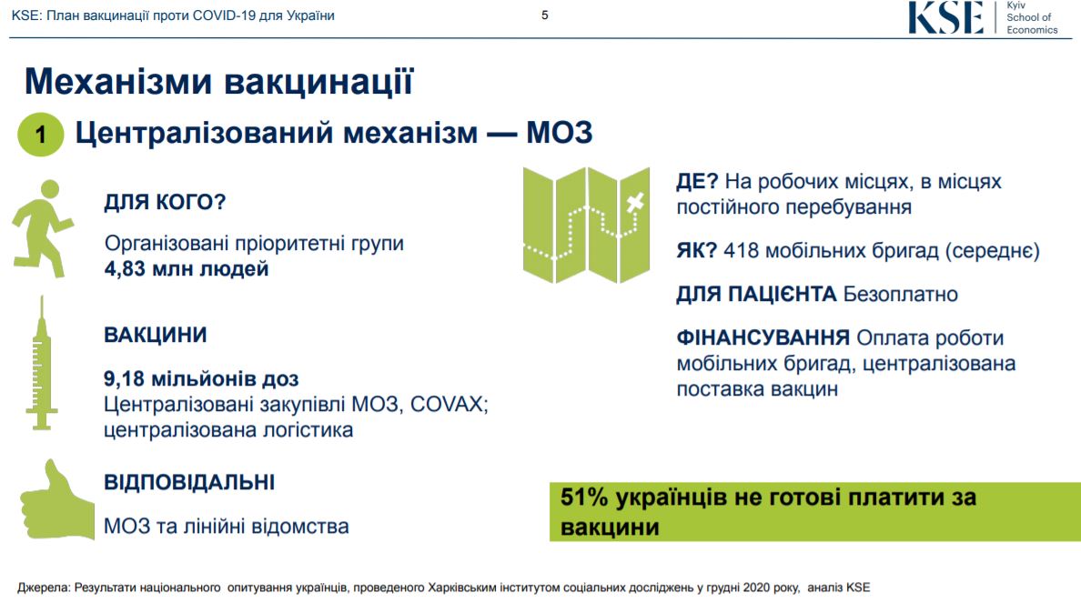 У дослідженні пропонується запровадити два паралельно чинні механізми вакцинації. По-перше, це централізована вакцинація на робочих місцях яку проводить МОЗ. По-друге, це програма "Доступні вакцини", тобто масова вакцинація у широкій мережі пунктів за відповідальності Національної служби здоров’я України.