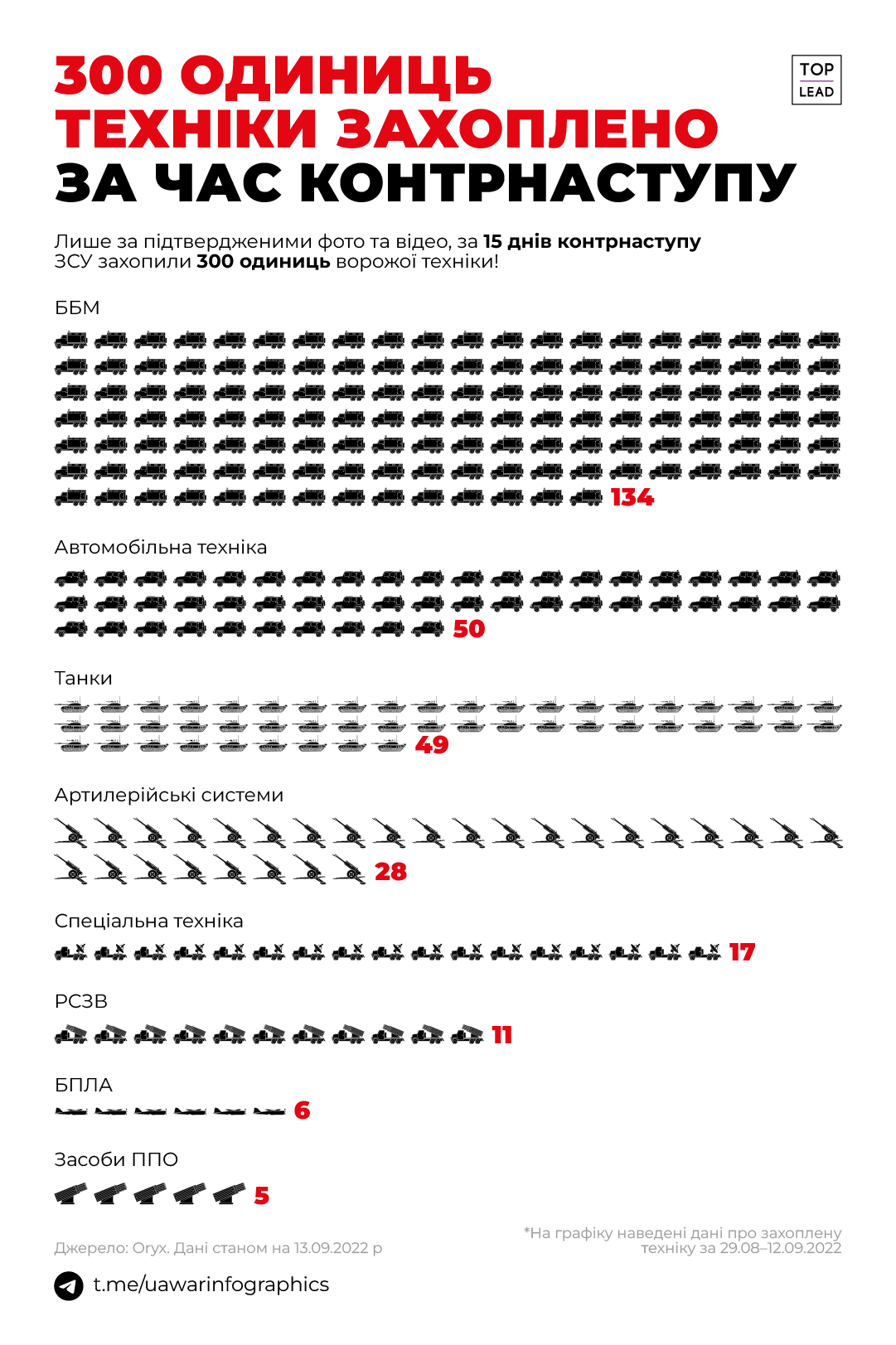 На початку вересня українські військові розпочали контрнаступ на Харківщині. За 15 днів просування до кордону України та РФ наші захисники захопили 300 одиниць ворожої техніки, свідчить інфографіка Top Lead, підготовлена на основі фото та відео з відкритих джерел.