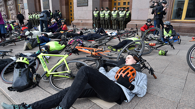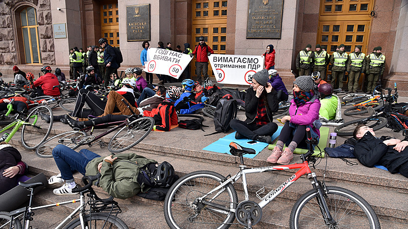 Біля входу до Київської міської державної адміністрації велосипедисти провели лежачий протест. Більше 20 людей з велосипедами та плакатами в четвер, 14 березня, розташувалися на сходах КМДА. Вони нагадали керівництву міста про прийнятої концепції розвитку велосипедного транспорту і необхідності забезпечити дотримання правил дорожнього руху в столиці.