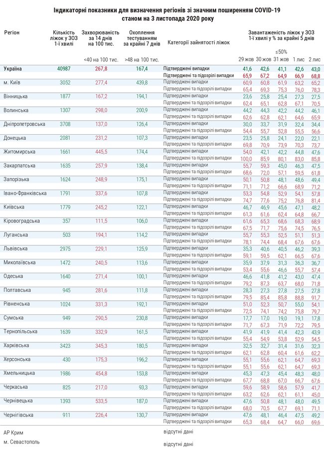 В Україні лікарняні ліжка, надані для пацієнтів з COVID-19 зайняті вже на 68,8%. Всього їх введено 40 987. Станом на 3 листопада жодна область України не відповідає всім необхідним критеріям для ослаблення протиепідемічних заходів, повідомляє прес-служба Міністерства охорони здоров'я.