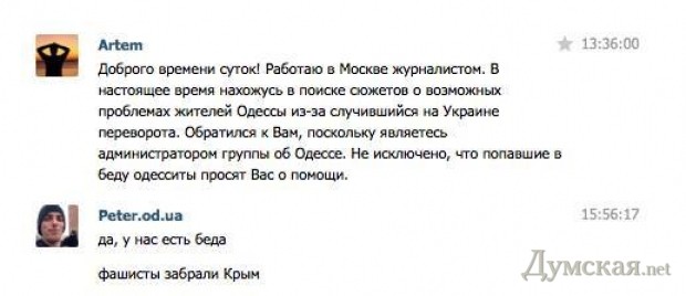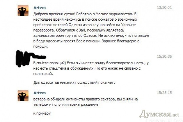 Як зазначає видання, що останнім часом багато одеські користувачі соціальних мереж почали отримувати пропозиції від людей, які видаються російськими журналістами. Їм пропонується за винагороду інсценувати і знімати на мобільні телефони провокаційні сюжети, наприклад, про те, як бойовики "Правого сектора" б'ють ветеранів.
