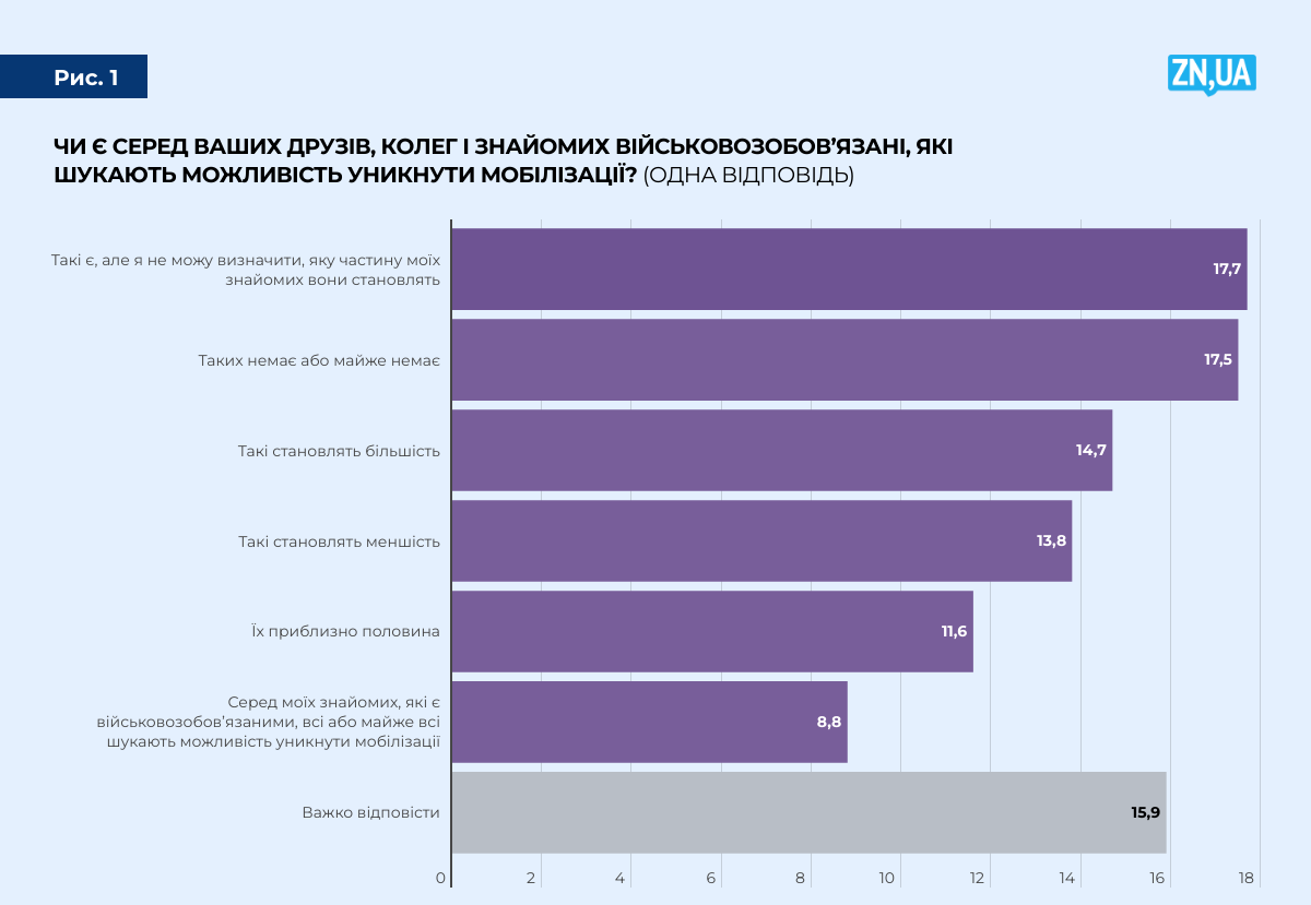 Так, 8,8% відповіли, що всі чи майже всі такі їхні знайомі шукають можливості, як не мобілізуватися. Ще 17,5% зазначили, що у них немає таких знайомих, або майже немає.