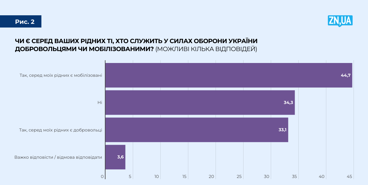 Лише 34,3% респондентів відповіли, що серед їх рідних немає ні добровольців, ні мобілізованих. За словами Литвинової, це досить схоже на реальні показники. Дослідження також показало, що мобілізованих більше, ніж тих, хто пішов воювати добровільно, — 44,7 і 33,1% відповідно.