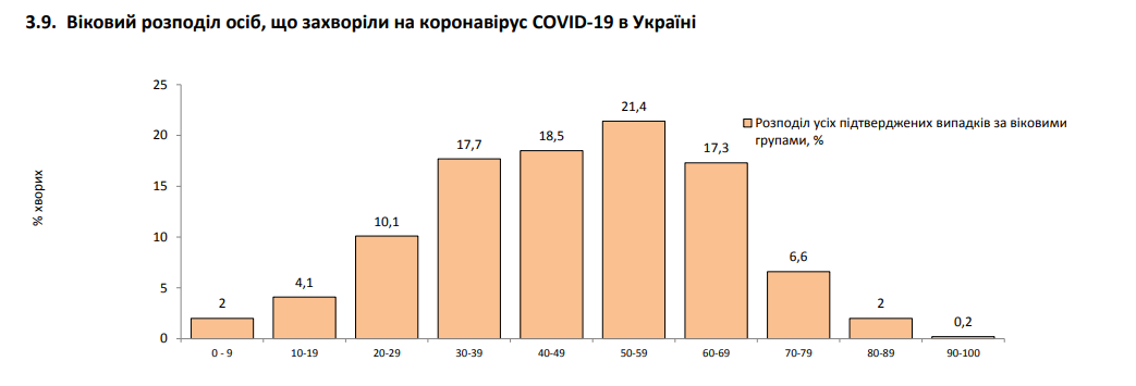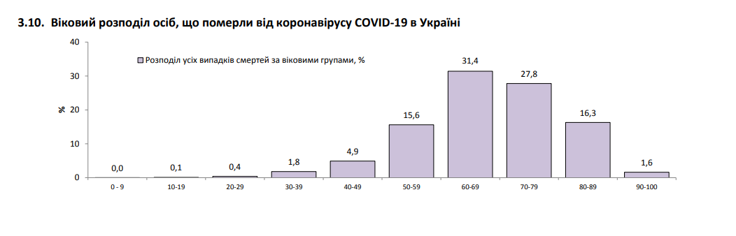 Згідно з даними РНБО, найчастіше від коронавірусу помирають люди у віці від 60 до 69 років (31,4 %), від 70 до 79 років (27,8 %).
