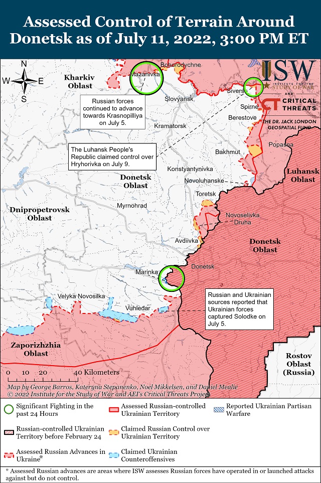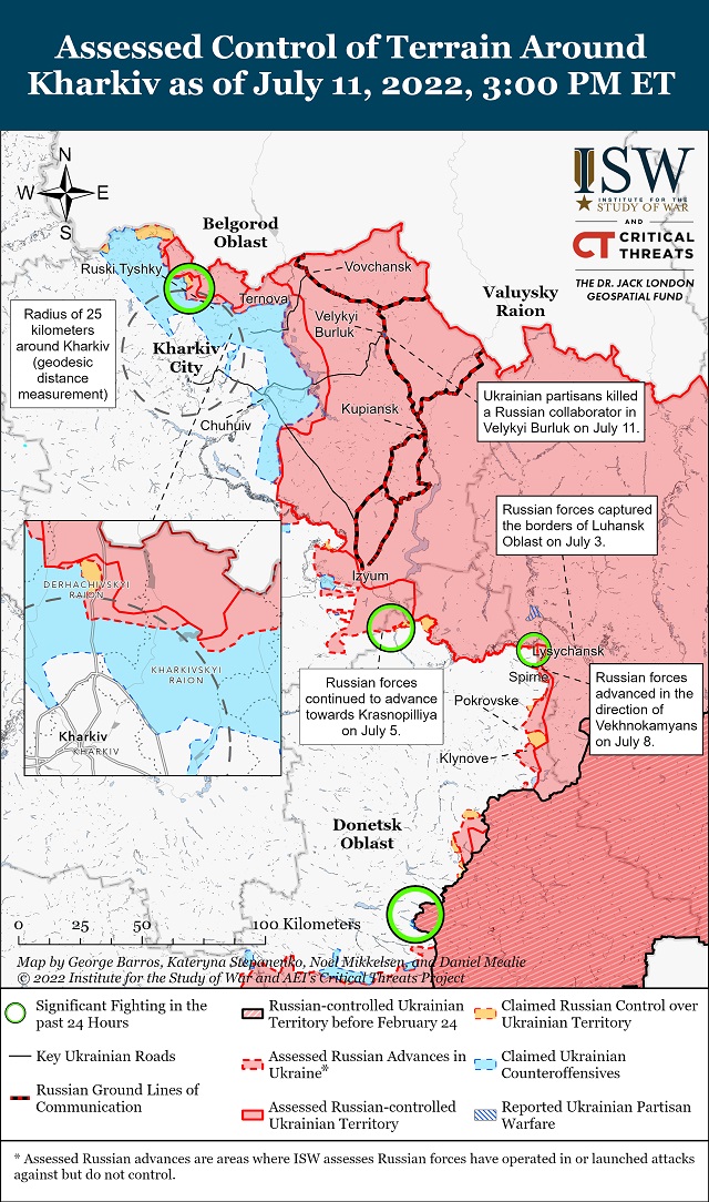 Також на окупованих територіях росіяни намагаються консолідувати адміністративний контроль та створити умови для потенційної анексії до Російської Федерації. Їм активно протидіють українські партизани, які продовжували обстріли російських колаборантів та російської окупаційної влади 10 та 11 липня. Невідомі вбили призначеного Росією голову Великого Бурлука (північно-східна Харківська область) Євгена Юнакова, заклавши вибуховий пристрій під його машині. Напад стався лише через чотири дні після того, як російська окупаційна влада оголосила про створення російської окупаційної адміністрації в окупованих населених пунктах Харківської області. Невідомі (ймовірно, українські партизани) намагалися вбити призначеного Росією голову Херсонської обласної військово-цивільної адміністрації Володимира Сальдо, заклавши біля його під’їзду саморобний вибуховий пристрій. Також був вчинений замах на голову Мелітопольського району Андрія Сігуту.