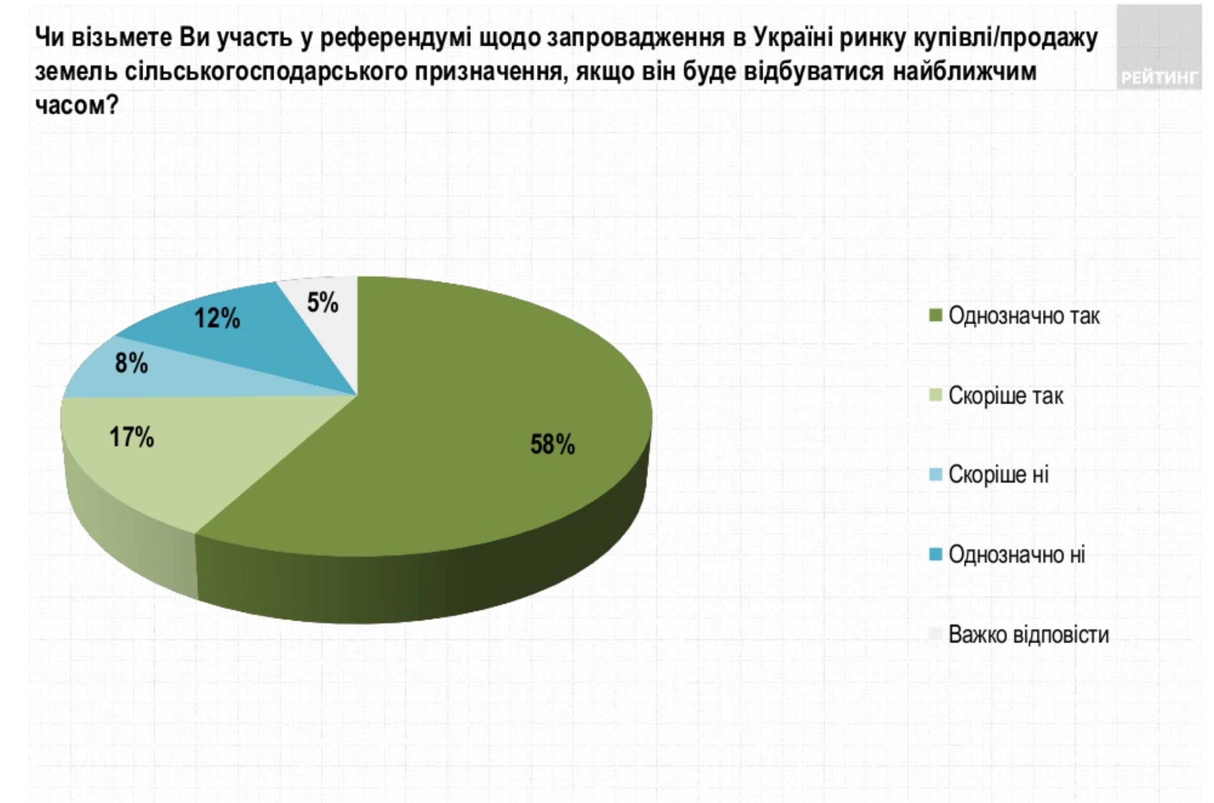 Щодо самого референдуму, то участь в ньому готові взяти 58% респондентів, 17% – скоріше б взяли участь, 20% – не взяли б участі.