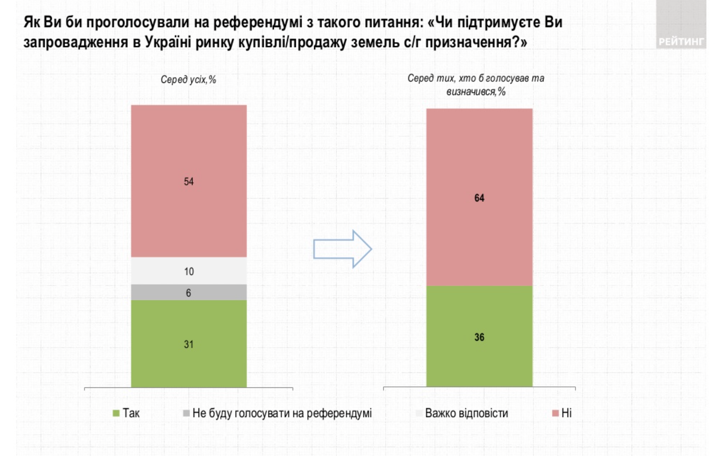 З тих, хто прийшов би на голосування, з відповіддю вже визначилися 64% - вони проголосували б проти запровадження в Україні ринку купівлі/продажу земель сільськогосподарського призначення. Інші 36% підтримали б цю ініціативу.