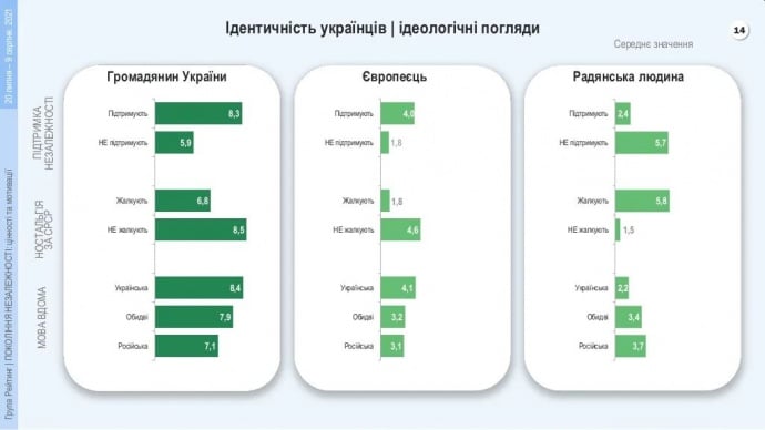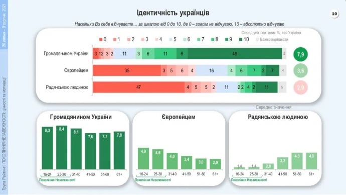Опитування показало, що серед представників «Покоління Незалежності» ідентифікують себе як громадяни України 86%, як європейці – 40%. Старші менше вважають себе європейцями, але частіше ніж інші ідентифікують себе як «радянську людину».