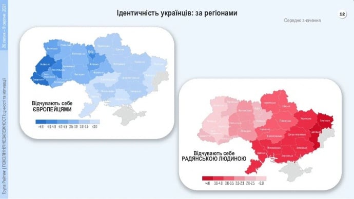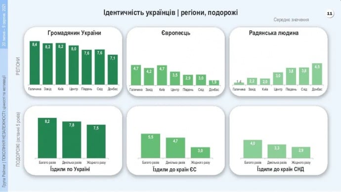 На заході України та в Києві більше відчувають себе європейцями, ніж радянськими людьми. У східних областях України – навпаки, більше ідентифікують себе з вихідцями з СРСР, ніж з Європи.