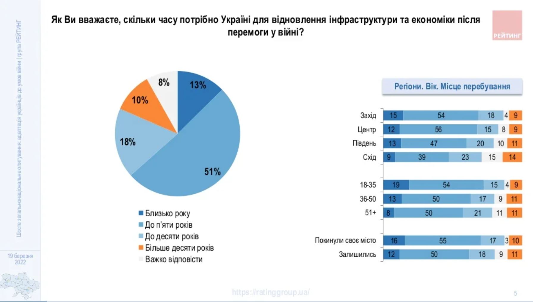 Так, 51% громадян переконаний, що на відбудову країни вистачить п’яти років. Ще 13% впевнені, що для цього знадобиться до року.