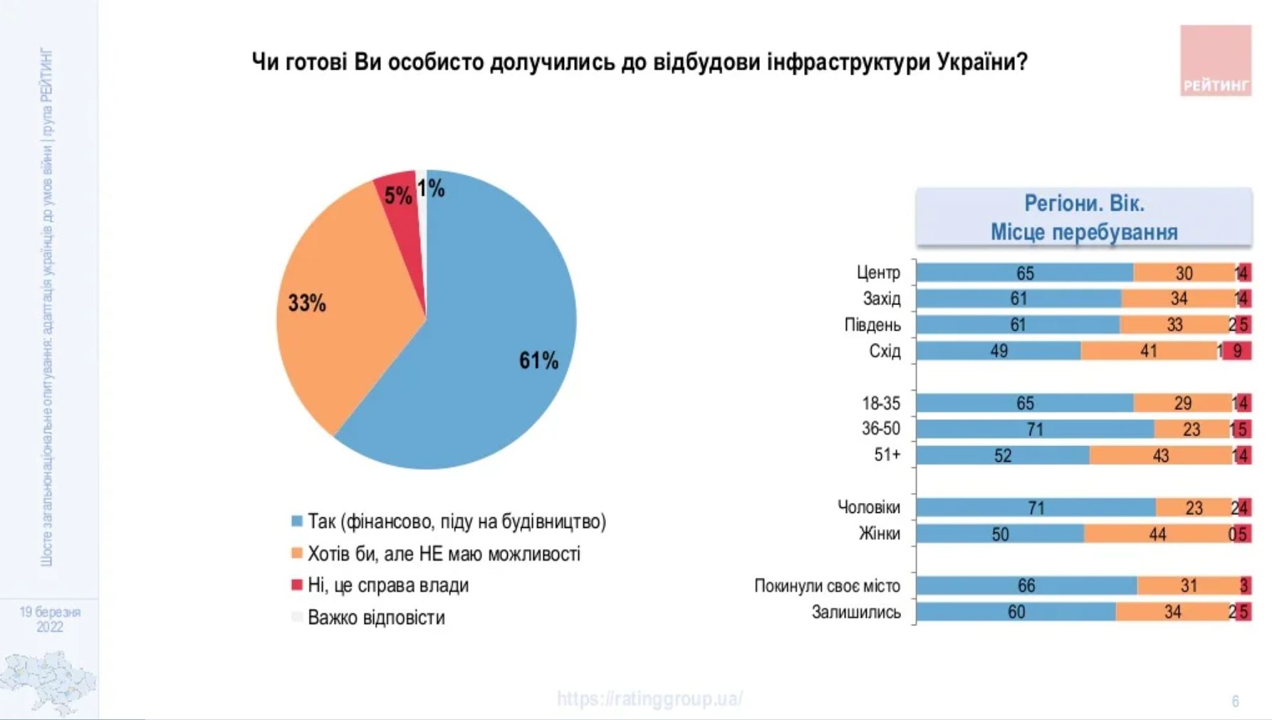Водночас українці готові не лише чекати, а й долучитися до відбудови країни. Зокрема, 61% опитаних хоче фінансово підтримати цей процес або піти працювати на будівництво. Ще 33% вказали, що хотіли б, але не мають такої можливості. І лише 5% українців вважають, що відбудова країни після війни – це справа виключно влади.