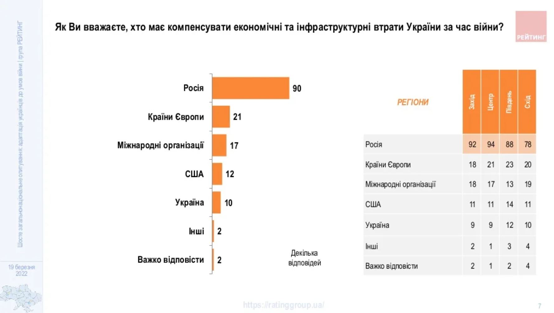 Якщо говорити про компенсацію економічних та інфраструктурних втрат, то 90% переконані, що відшкодувати збитки має країна-агресор РФ. Окрім цього, 21% українців вважає, що до цього мають долучитися країни Європи, 17% - міжнародні організації, 12% – США і лише 10% - Україна.