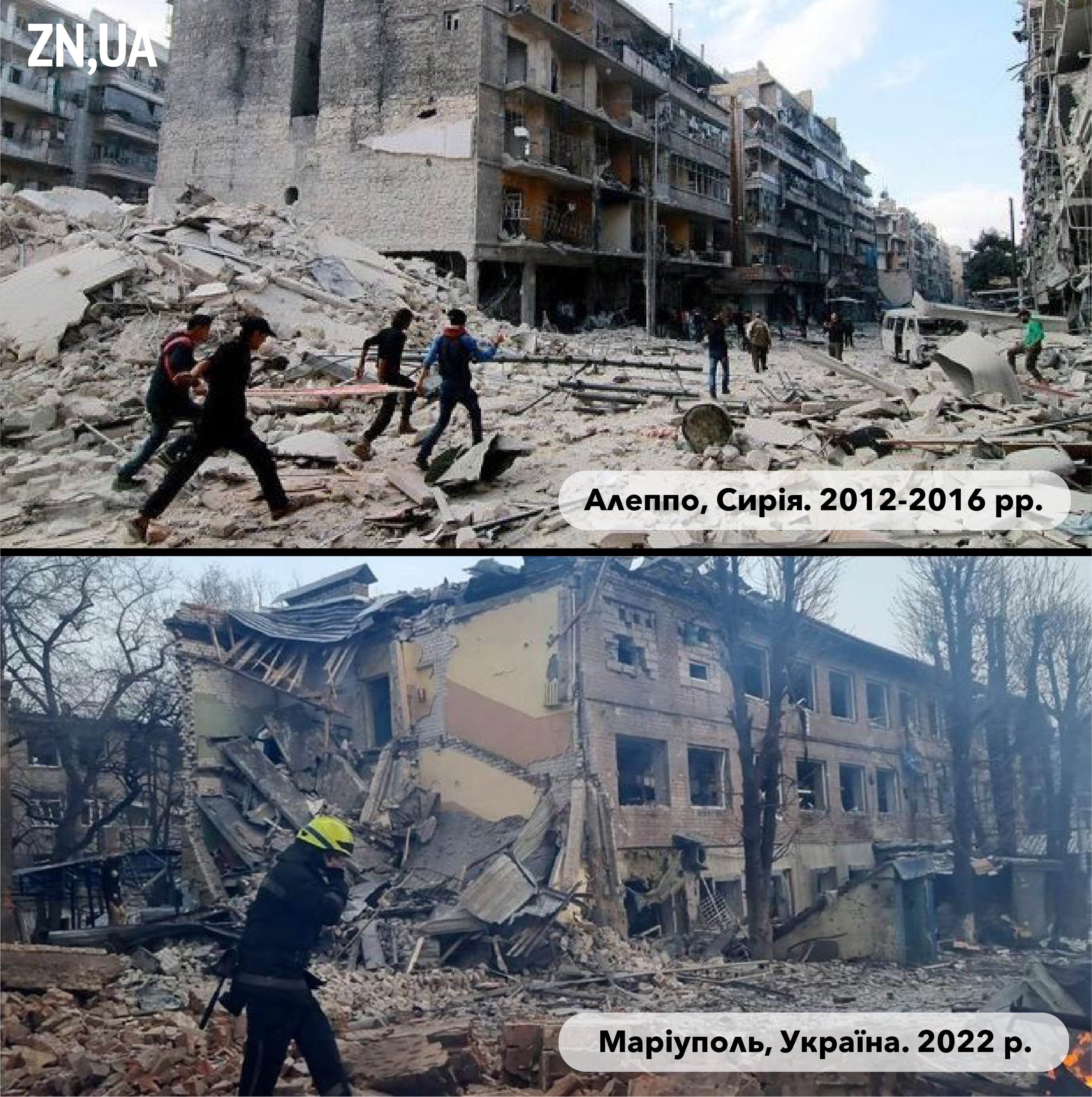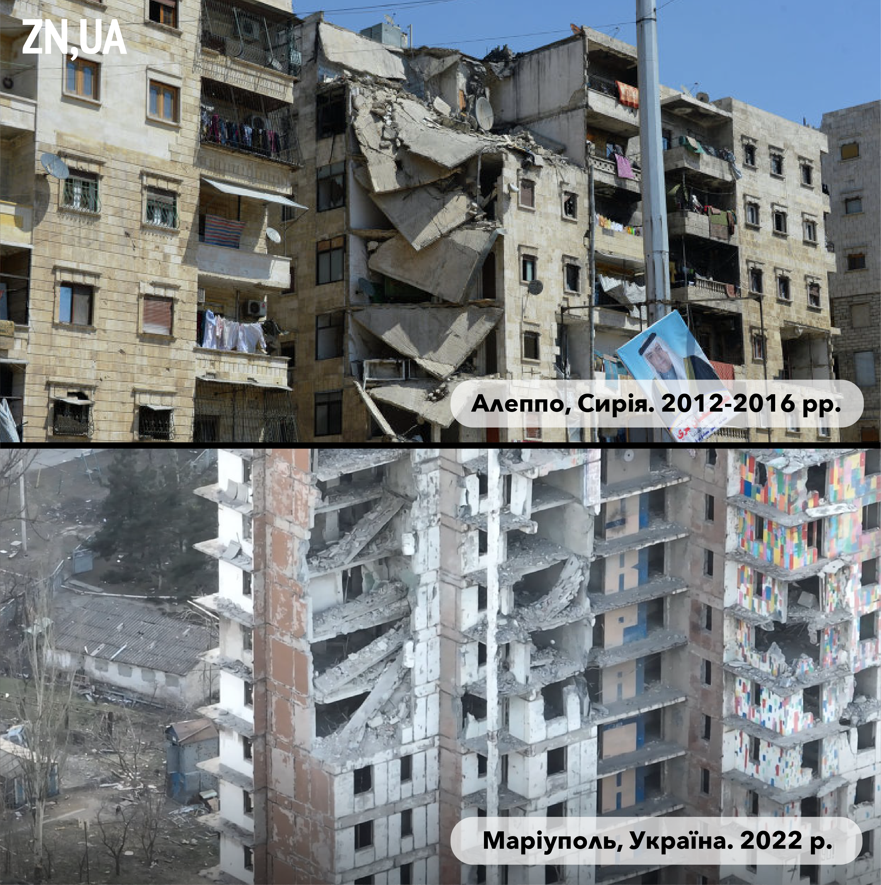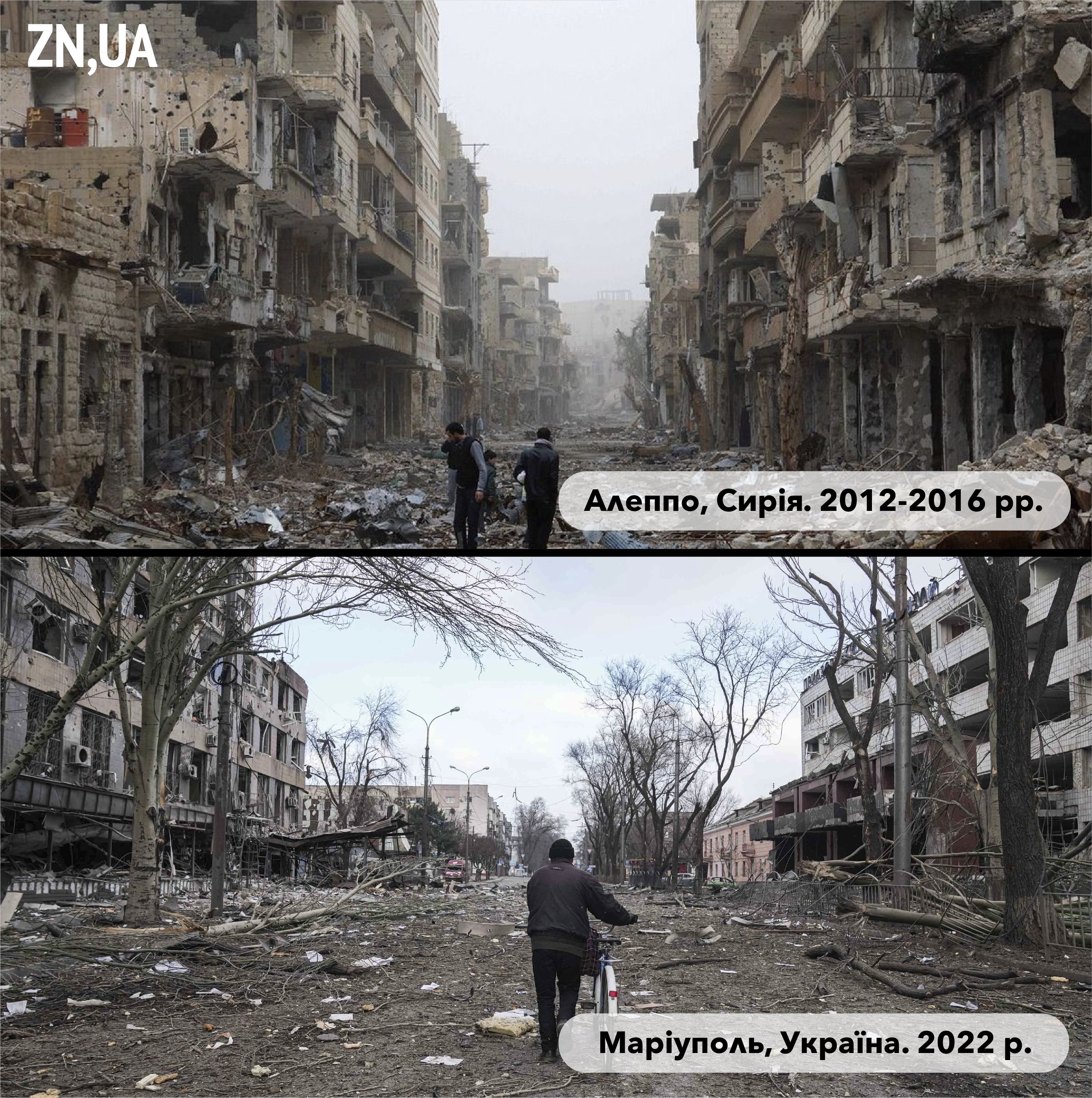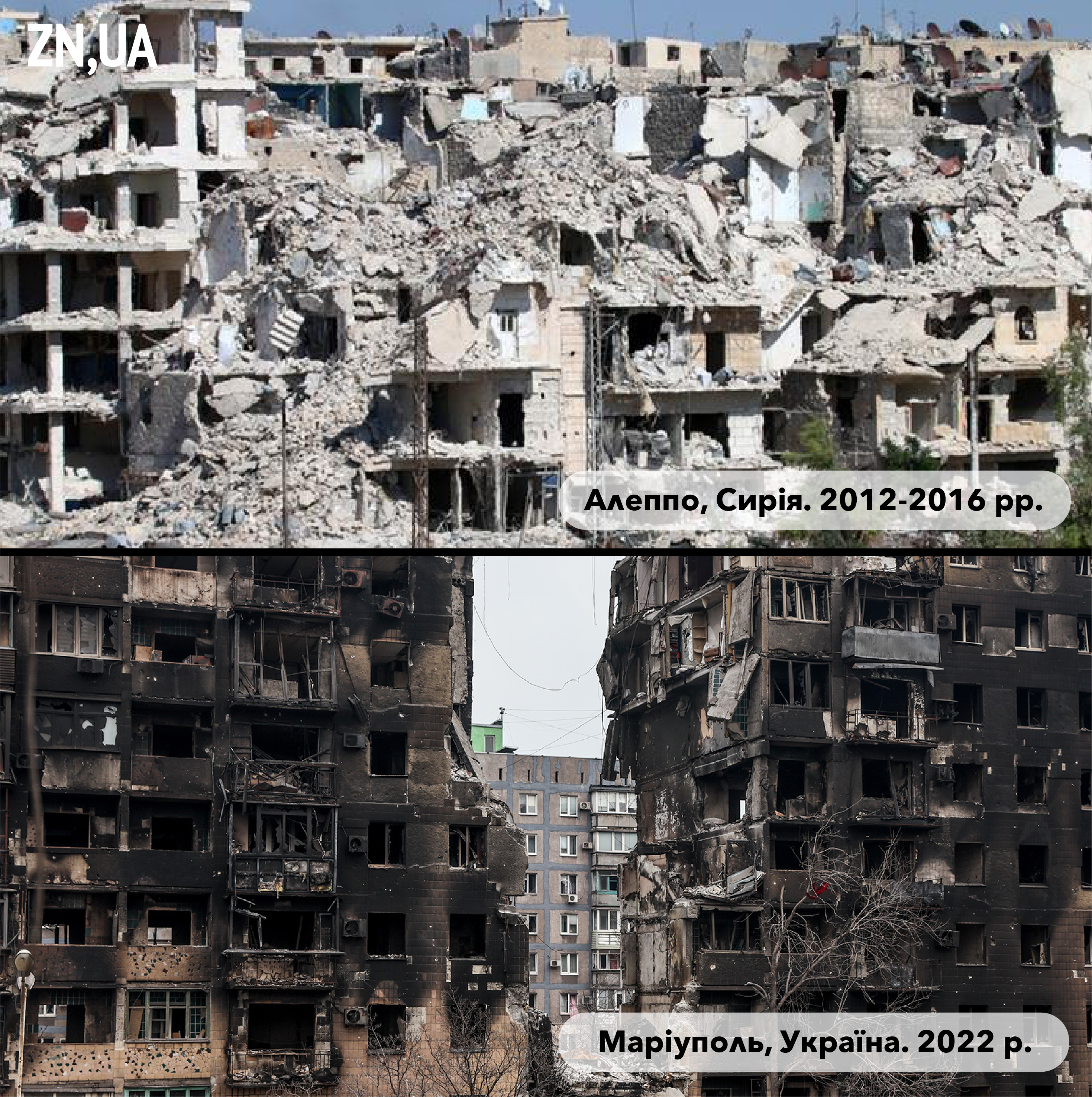 У 2011 році російські загарбники почали знищувати Алеппо в Сирії. Місто зазнало жорстокого бомбардування, проти людей застосували хімічну зброю. Війна перетворила Алеппо на руїни та братські могили. Для багатьох бомбардування українського Маріуполя стало повторенням Алеппо. Редакція ZN.UA порівняла ці трагедії.