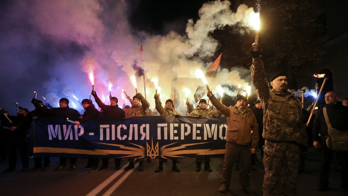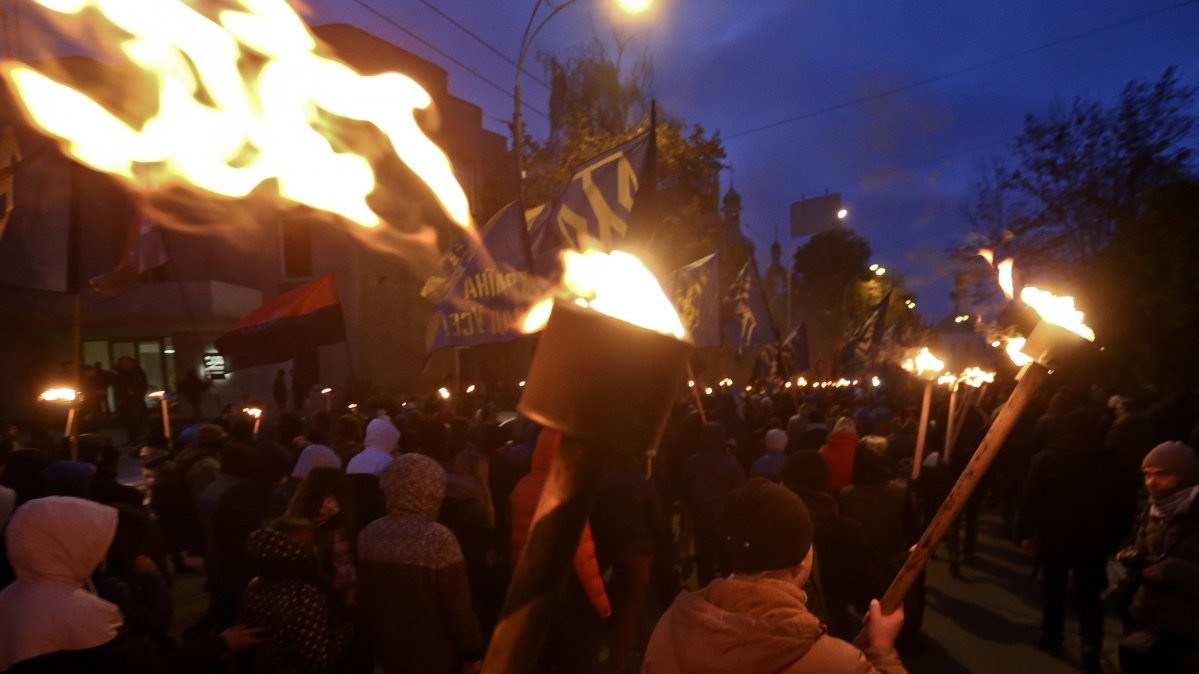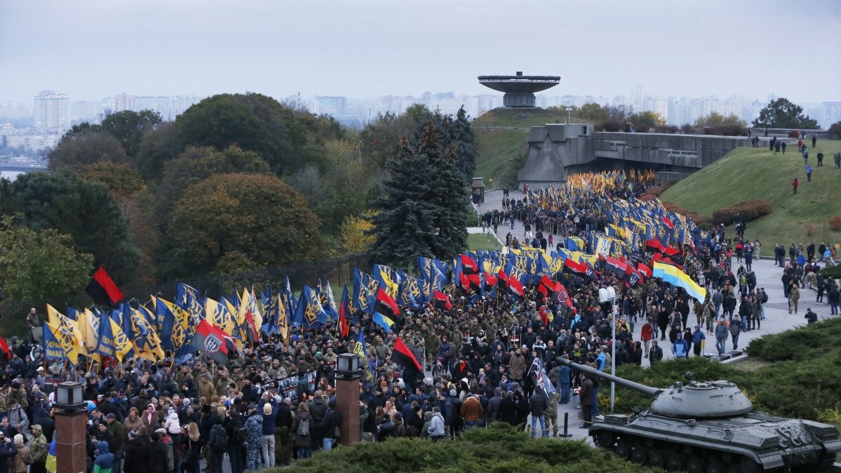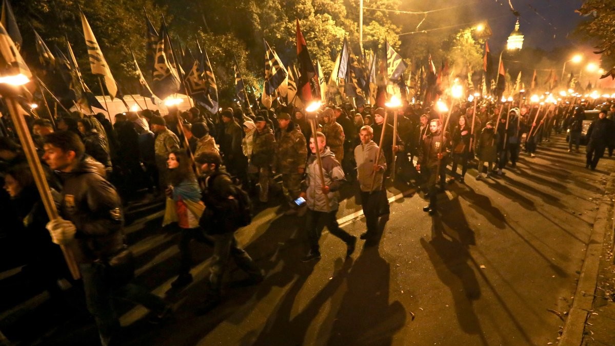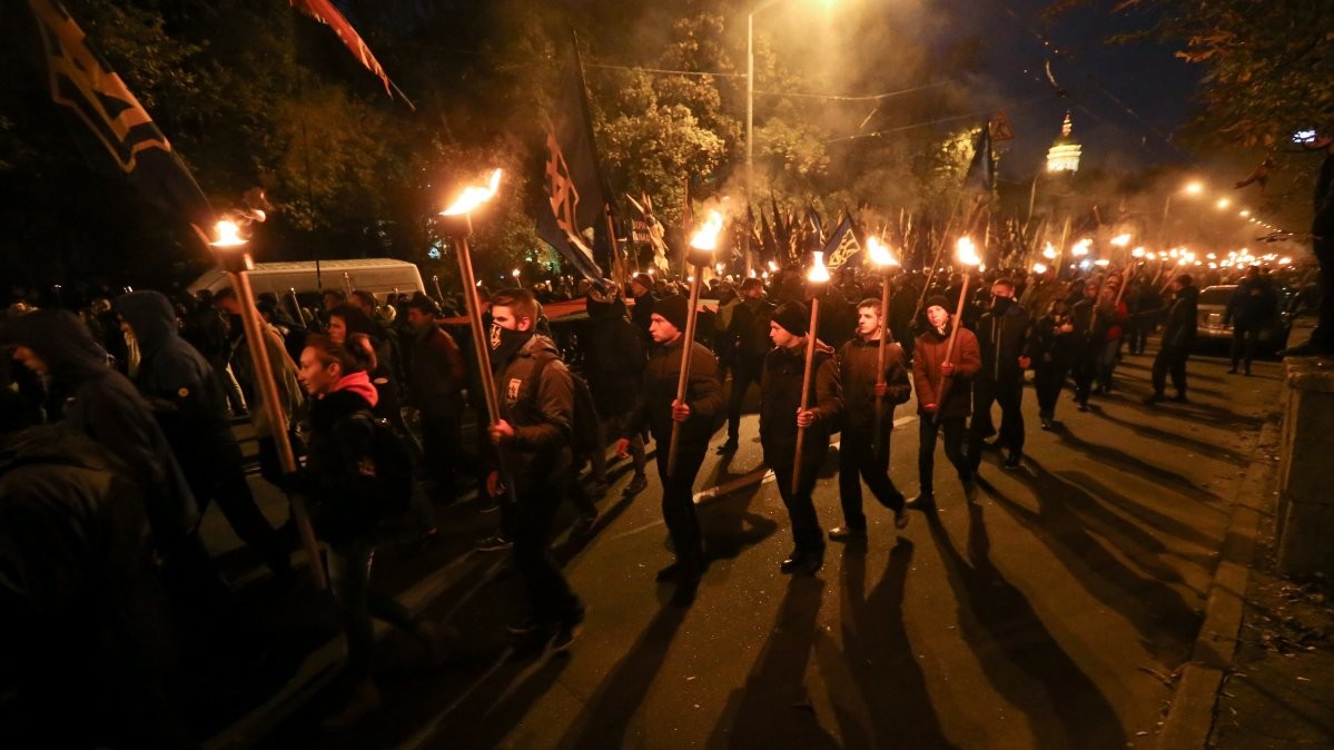 У Києві "Марш нації", який зібрав близько 5 тис осіб у п'ятницю, 14 жовтня, закінчив ходу на Софійській площі в центрі міста. Люди прийшли на площу з безліччю палаючих факелів, прапорами "Правого сектора", полку "Азов", національними прапорами.