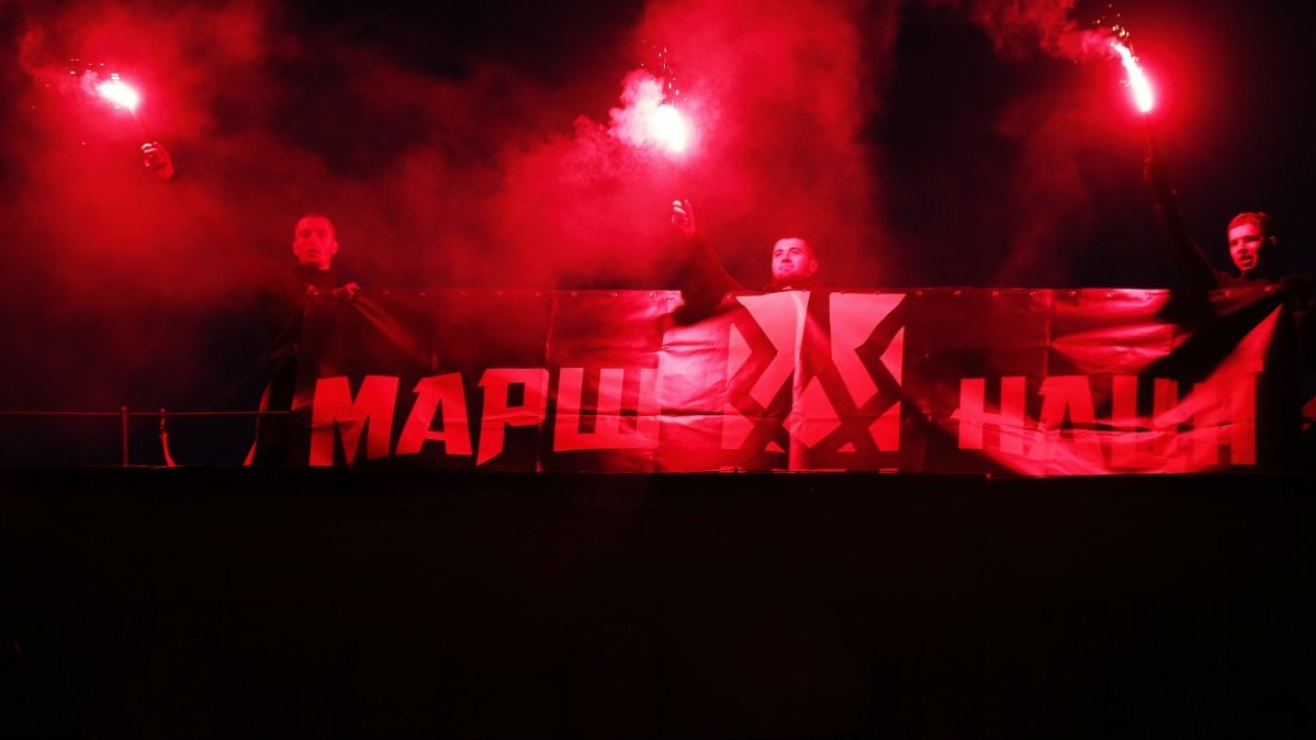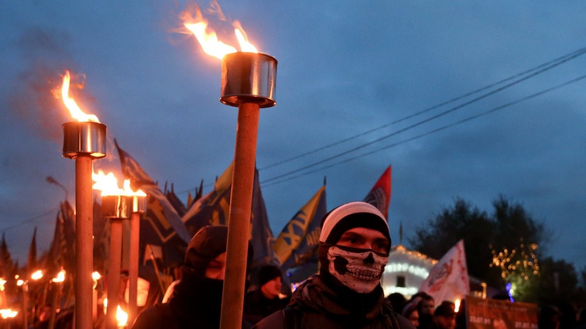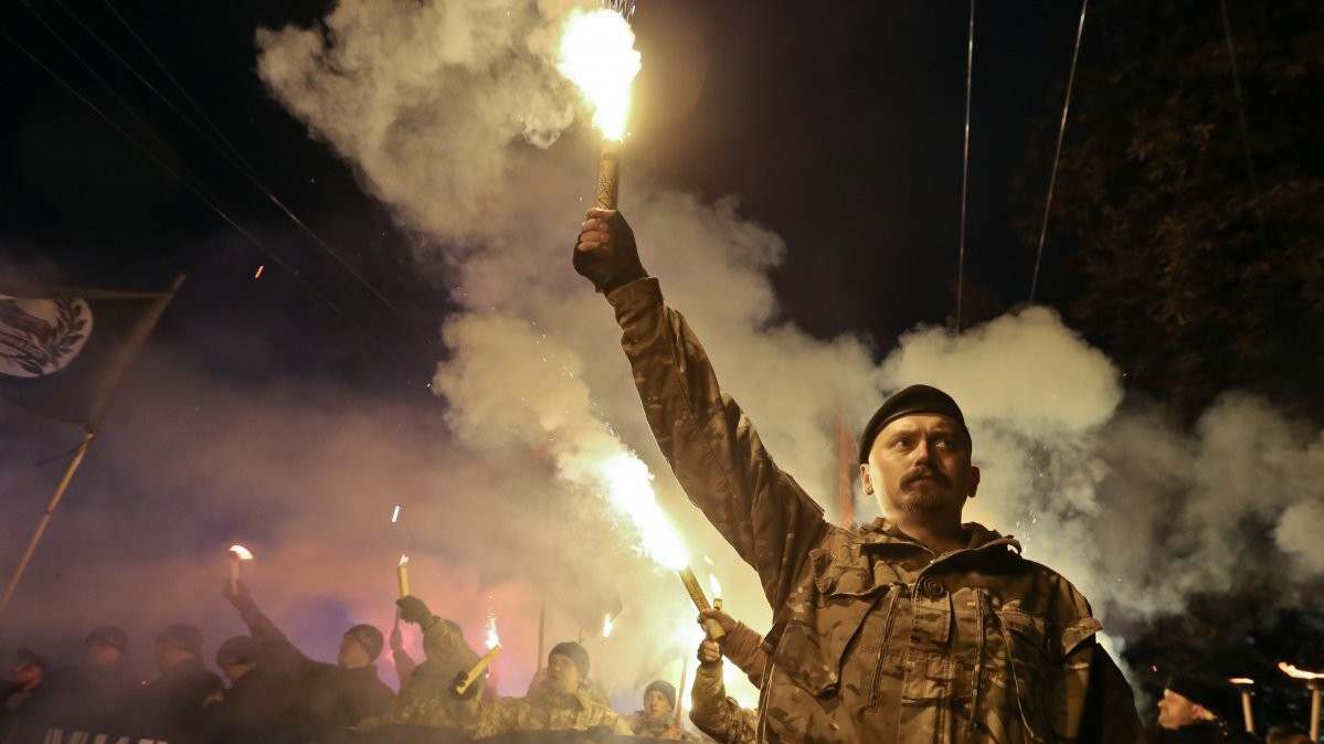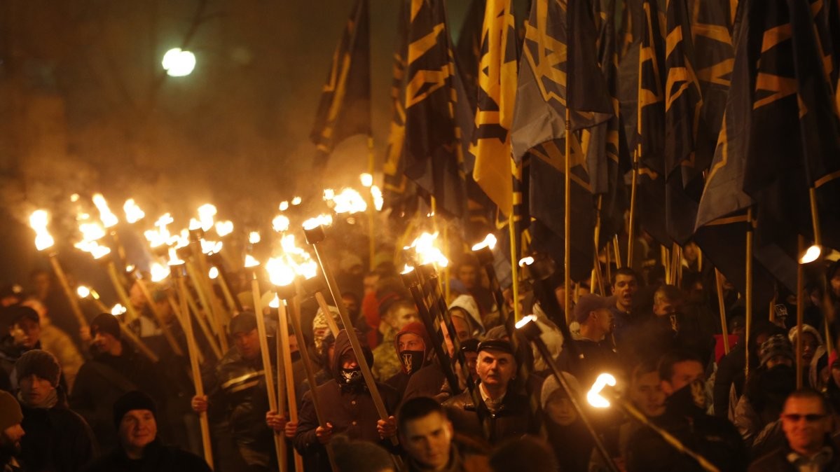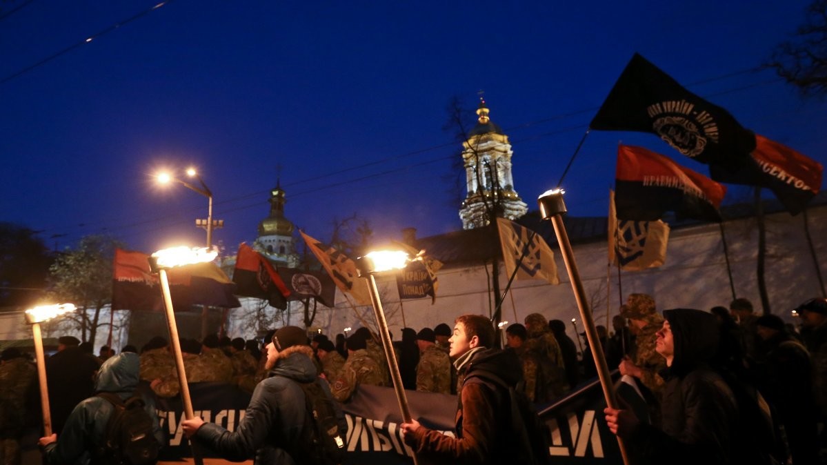 У Києві "Марш нації", який зібрав близько 5 тис осіб у п'ятницю, 14 жовтня, закінчив ходу на Софійській площі в центрі міста. Люди прийшли на площу з безліччю палаючих факелів, прапорами "Правого сектора", полку "Азов", національними прапорами.