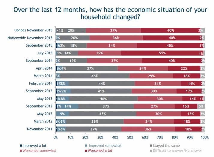 Серед жителів підконтрольного Україні Донбасу погіршення фінансового стану відчули 77% (40% – значне), деяке поліпшення відзначили менше 1% опитаних, значне поліпшення – ніхто. У 20% опитаних фінансовий стан не змінився.
