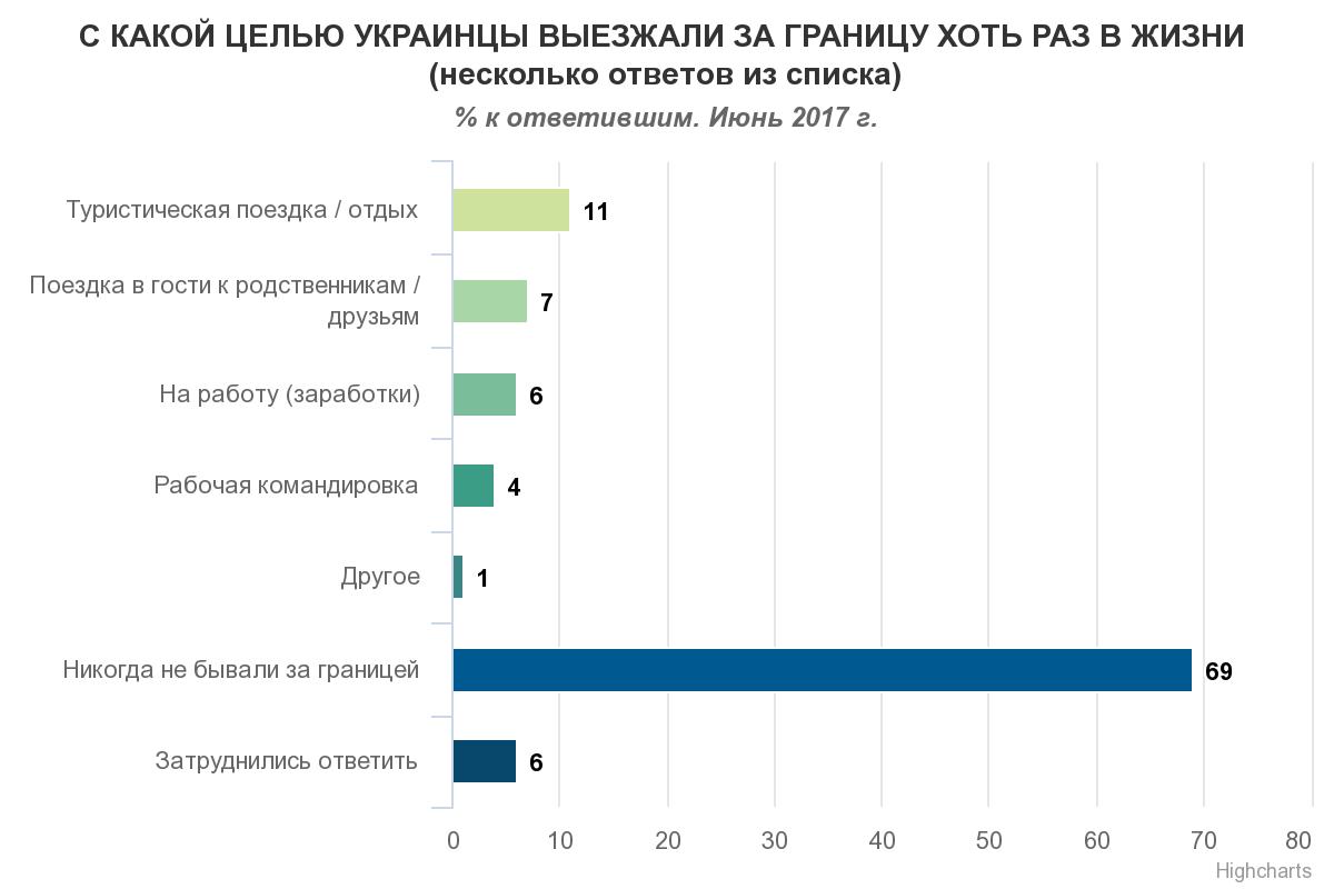 Основними цілями закордонних поїздок близько третини (29%) українців, які бували за кордоном, є туристичні поїздки (11%), поїздки в гості до родичів і друзів (7%), а також на заробітки (6%) та у робочі відрядження (4%).