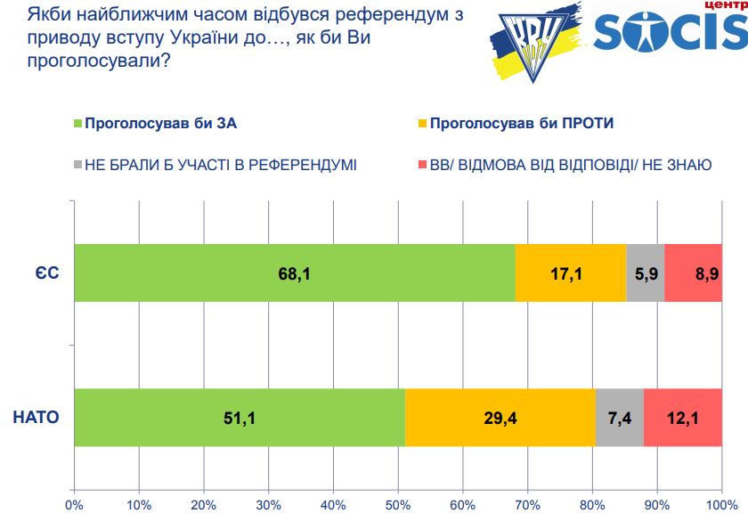 Що стосується вступу України в НАТО, 51,1% відповіли б ствердно на питання референдуму про членнстве, 29,4% проголосували б проти, 7,4% не брали б участі у референдумі, а 12,1% відмовилися або не знали відповіді.