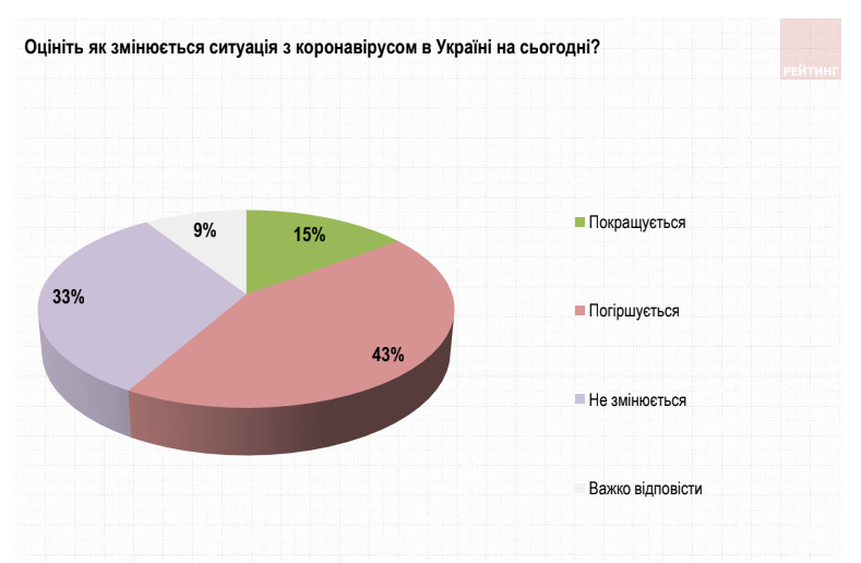 43% опитаних українців вважає, що ситуація з коронавірусом в Україні погіршується. Про це свідчать результати проведеного 24-25 квітня опитування Соціологічної групи "Рейтинг".