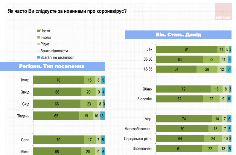 Згідно з результатами опитування, 68% респондентів часто слідкують за новинами про коронавірус, 19% роблять це інколи, 9% - рідко. 5% взагалі не цікавляться такими новинами. При цьому частіше відслідковують новини про коронавірус люди старшого віку, жінки та бідніші опитані.