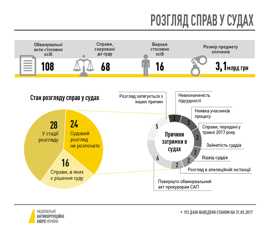 Станом на 31 травня, серед 68 кримінальних справ, у яких детективи 3 завершили досудове слідство, а прокурори САП скерували обвинувальний акт до судів, 24 провадження залишаються без судового розгляду.