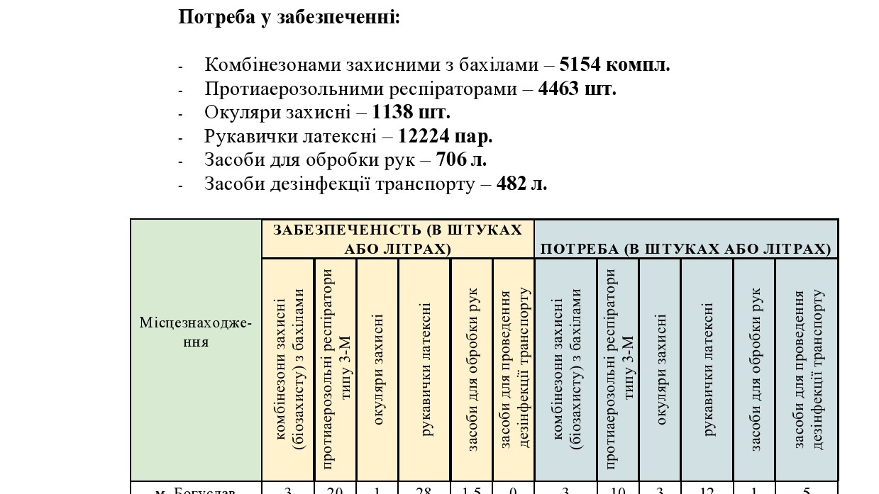 - Комбінезонами захисними з бахілами – 1037 комплектами (потрібно – 5 154)