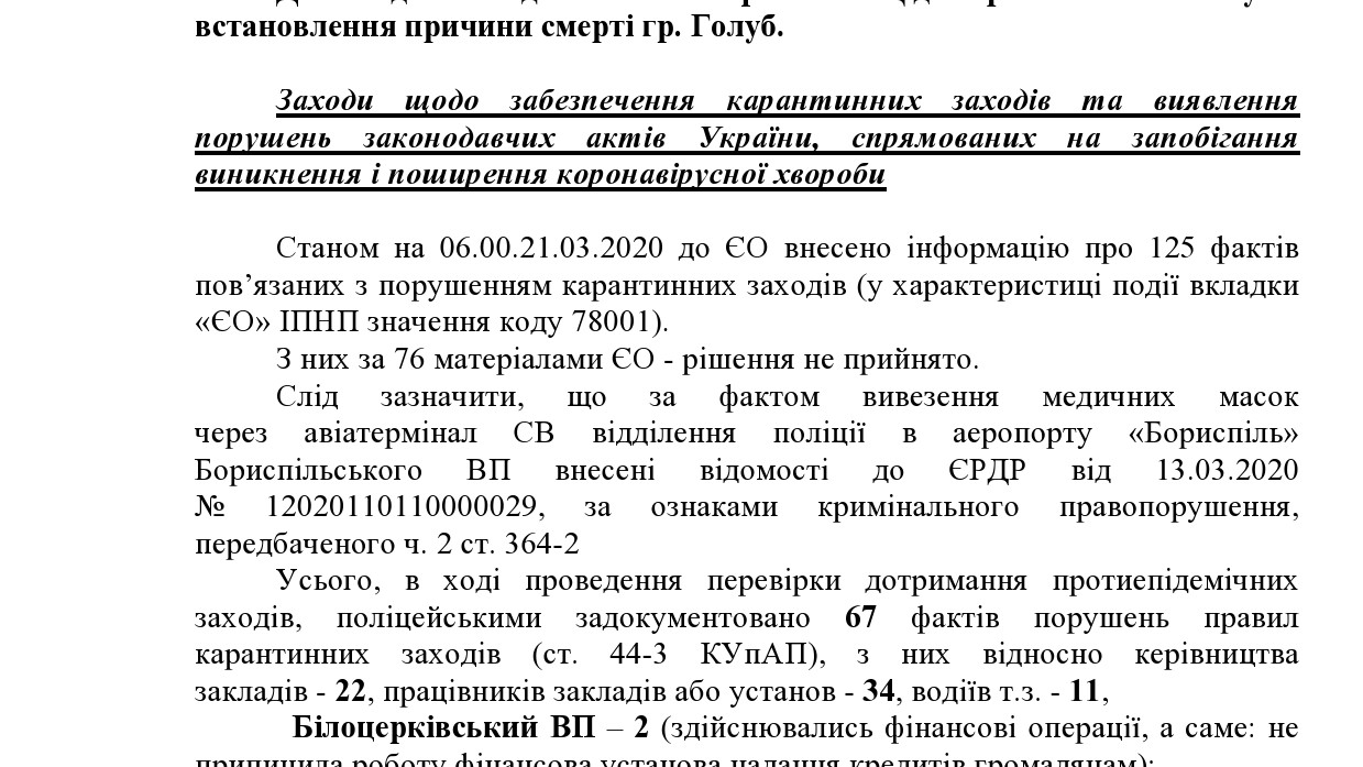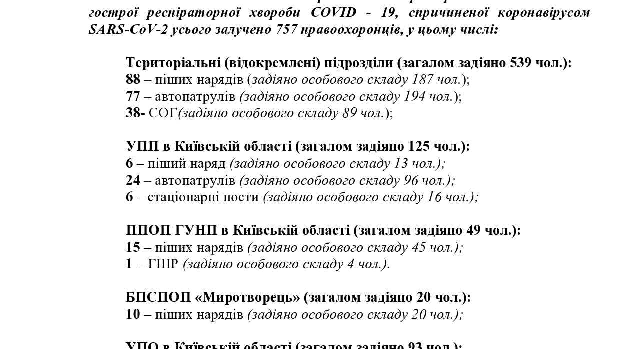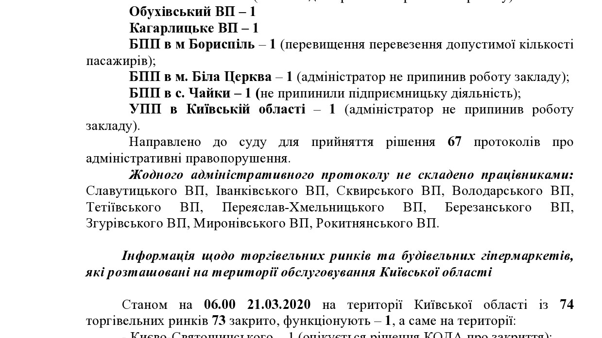 У розпорядженні ZN.ua виявилося офіційне зведення Ситуативного центру ГУ Національної поліції в Київській області про стан моніторингу оперативної обстановки, пов'язаної з поширенням коронавірусу SARS-CoV-2 (COVID-19) станом на 06.00 21.03.2020