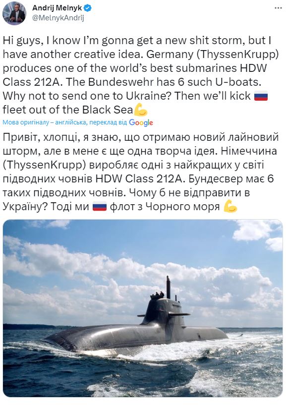 «В мене є ще одна творча ідея. Німеччина (ThyssenKrupp) виробляє одні з найкращих у світі підводних човнів HDW Class 212A. Бундесвер має 6 таких підводних човнів. Чому б не відправити в Україну? Тоді ми російський флот з Чорного моря…», – написав Мельник у Twitter.