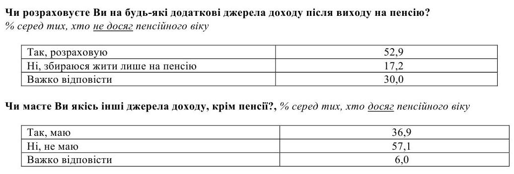 Лише 17,2% з тих респондентів, хто ще не досяг пенсійного віку, збираються після виходу на пенсію жити лише на державну пенсію, 52,9% розраховують також на інші джерела доходів (30% не визначилися), свідчать дані опитування Центру Разумкова.