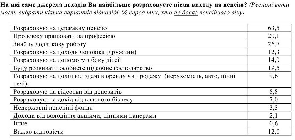 Більшість тих, які ще не досягли пенсійного віку, після виходу на пенсію найбільше розраховують як на джерело доходів на державну пенсію (63,5%), однак сподіваються і на інші джерела доходів.