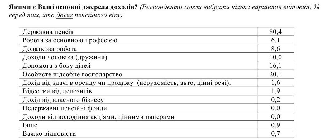 Для 80,4% пенсіонерів державна пенсія є основним джерелом доходів, однак мають і інші джерела доходів.