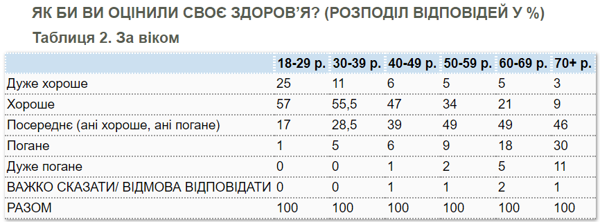 При цьому, чим старша вікова група опитаних, тим менше серед них людей, які вважають себе здоровими. Так, серед респондентів у віці від 18 до 29 років здоровими себе почувають 82%, у віковій групі 30-39 років - 67%, у віці 40-49 років - 53%, у віці 50-59 років - 39%, у віці 60-69 років - 26%, а серед людей у віці 70 років або старше - 12%.