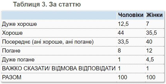 У свою чергу чоловіки в Україні оцінюють своє здоров'я трохи краще, ніж жінки. Зокрема, серед чоловіків вважають себе здоровими 56% опитаних, серед жінок - 43%. Також 9% серед чоловіків оцінюють своє здоров'я як погане або дуже погане, а серед жінок такої думки дотримується 17% респондентів.