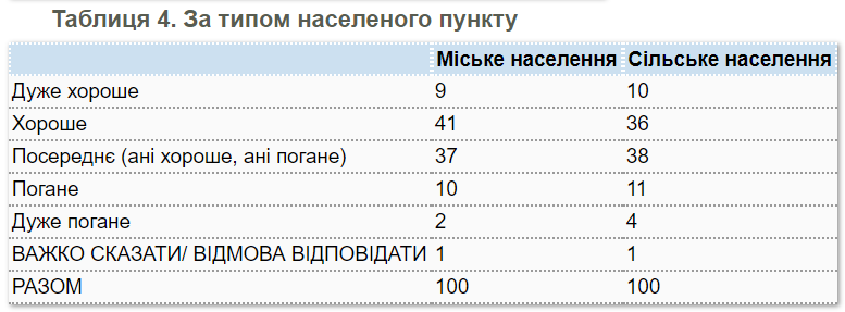 У містах здоровими себе почувають 50% опитаних, а в сільській місцевості - 46%. На думку соціологів, це може бути пов'язано з умовами праці, рівнем матеріального добробуту, доступністю послуг з охорони здоров'я і більш розвиненою в містах мережею лікувальних установ.