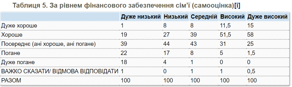 Якщо говорити про матеріальний добробут, то серед найменш заможних громадян здоровими себе вважають 20% українців. Серед людей з високим рівнем матеріального добробуту добре оцінюють свій стан здоров'я 63% опитаних, а серед людей з дуже високим рівнем фінансового забезпечення - 73%.