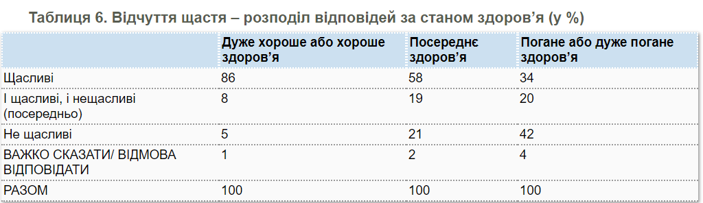 Також, опитування показало, що стан здоров'я - це важлива умова для відчуття щастя в українців. Так, серед тих, хто добре оцінює своє здоров'я, відчувають себе щасливими 86%, а серед тих, хто вважає свій стан здоров'я поганим, щасливими себе називають 34%.