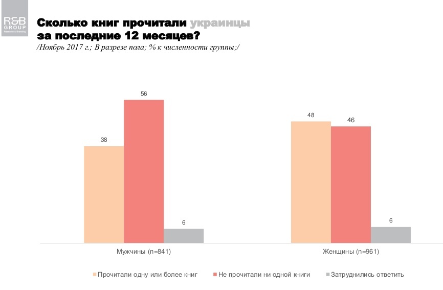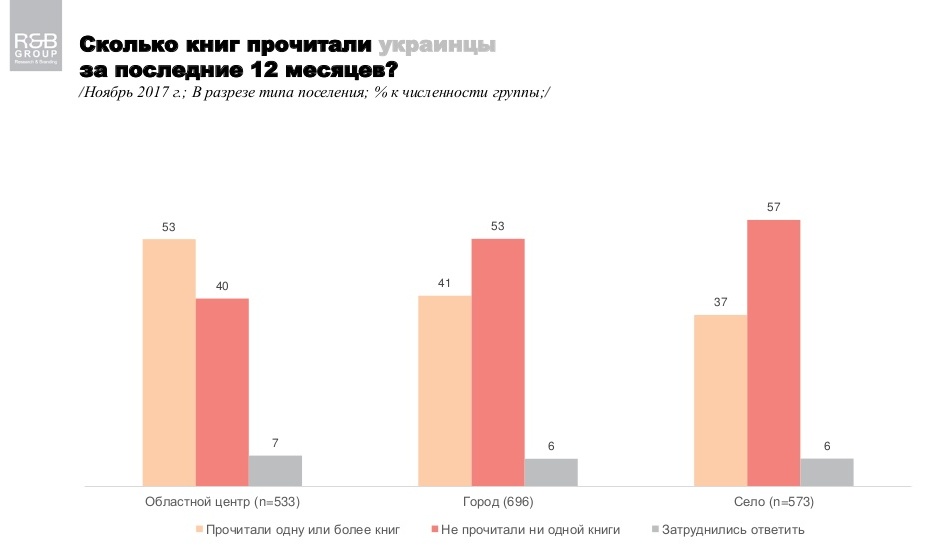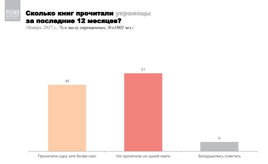 Більшість опитаних заявили, що протягом аналізованого періоду вони або взагалі не прочитали жодної книги (51%), або не змогли відповісти, чи читали вони що-небудь чи ні (6%).