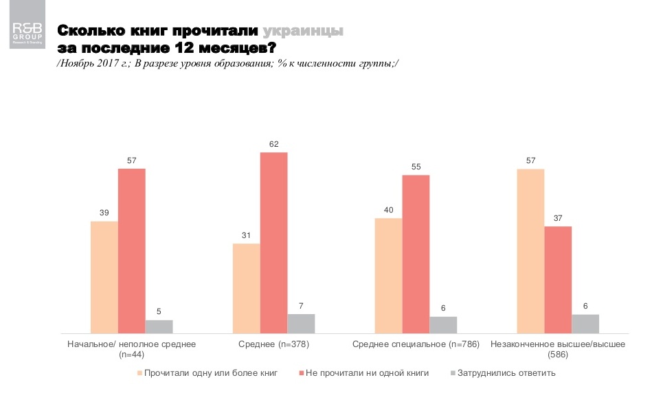 Менше половини українців (43%) за останній рік прочитали хоча б одну книгу, свідчать дані опитування, проведеного компанією Research & Branding Group у жовтні-листопаді 2017 року.