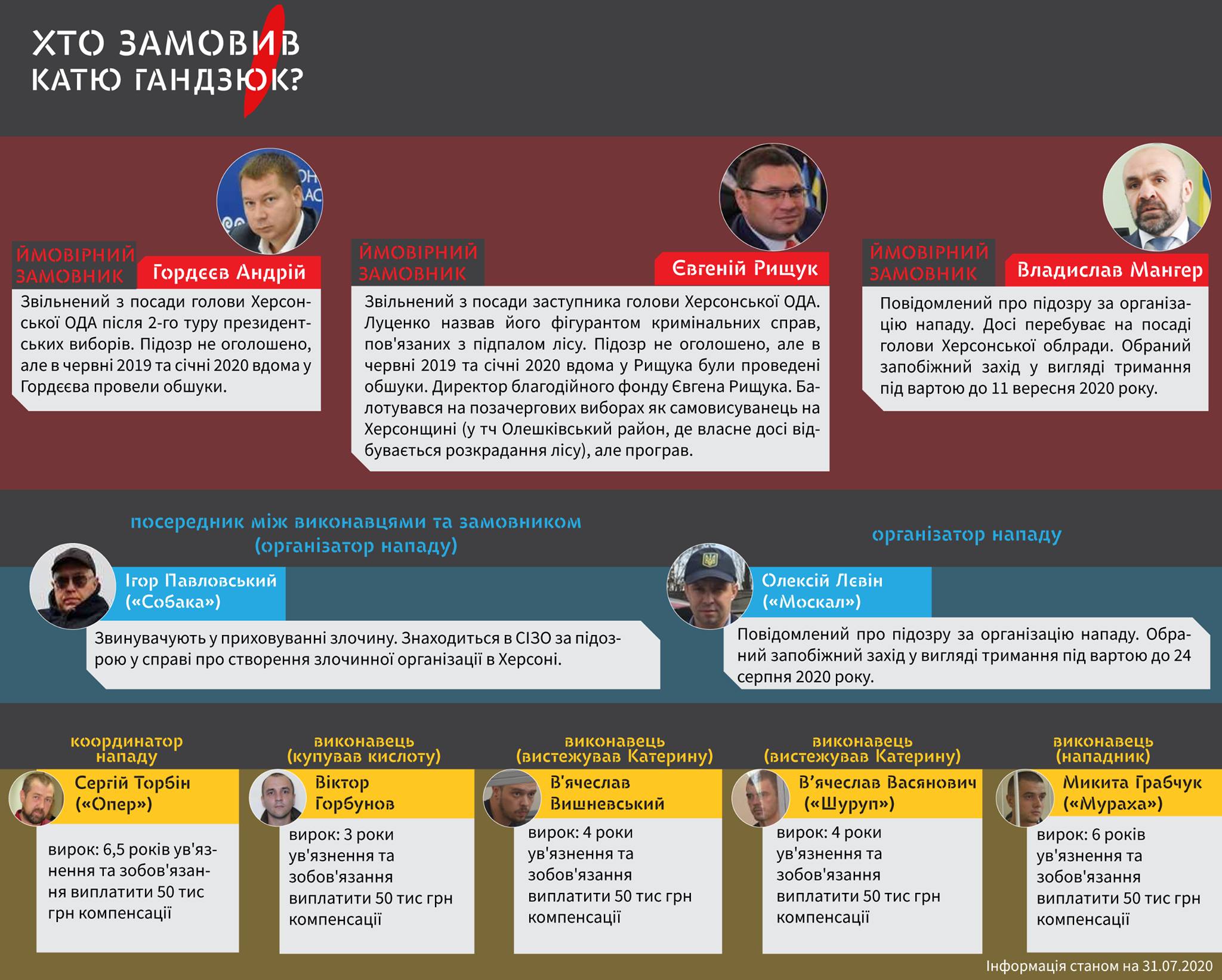 Друзі Каті Гандзюк оприлюднили інфографіку з прізвищами та посадами тих, кого вважають причетними до вбивства. Водночас у ній немає прізвищ тих, хто допомагав «зливати» справу. «Але вже сьогодні ми певні — рано чи пізно усіх причетних змусять відповідати», - підсумували вони.
