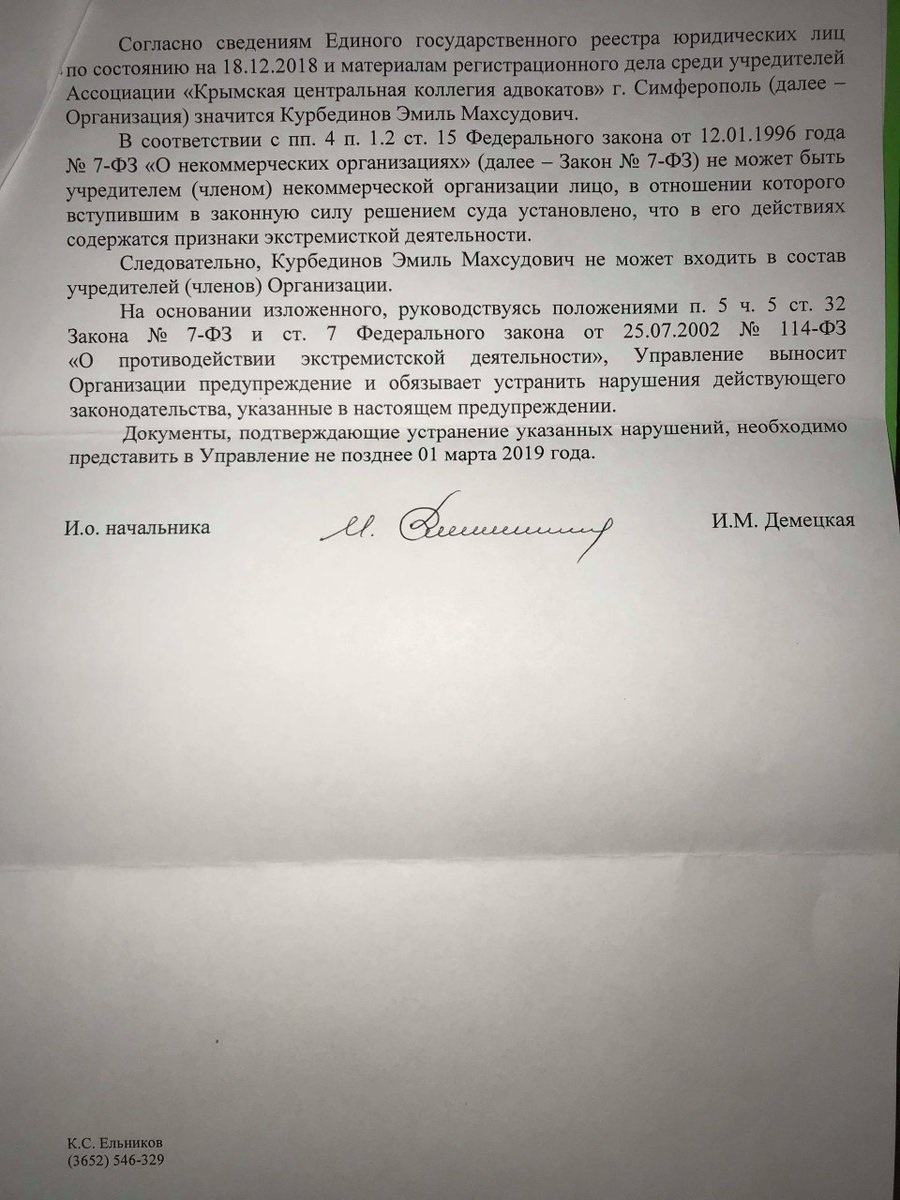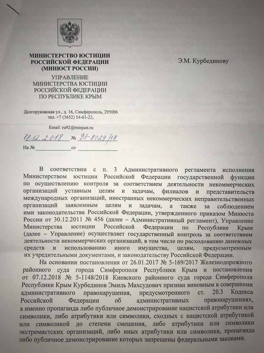 "Відповідно до пп. 4 п. 1.2 ст. 15 Федерального закону від 12.01.1996 № 7-ФЗ "Про некомерційні організації"... не може бути засновником (членом) некомерційної організації особа, щодо рішенням суду, яке набрало чинності, встановлено, що в його діях містяться ознаки екстремістської діяльності. Отже, Курбедінов Еміль Махсудович не може входити до складу засновників (членів) Організації", - йдеться в листі управління Мін'юсту РФ в окупованому Криму.