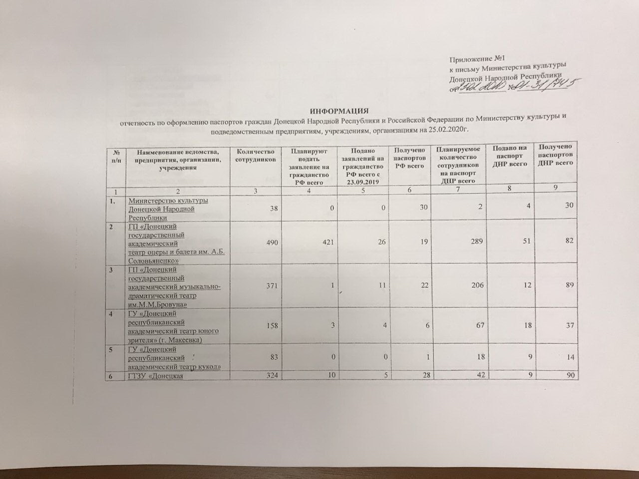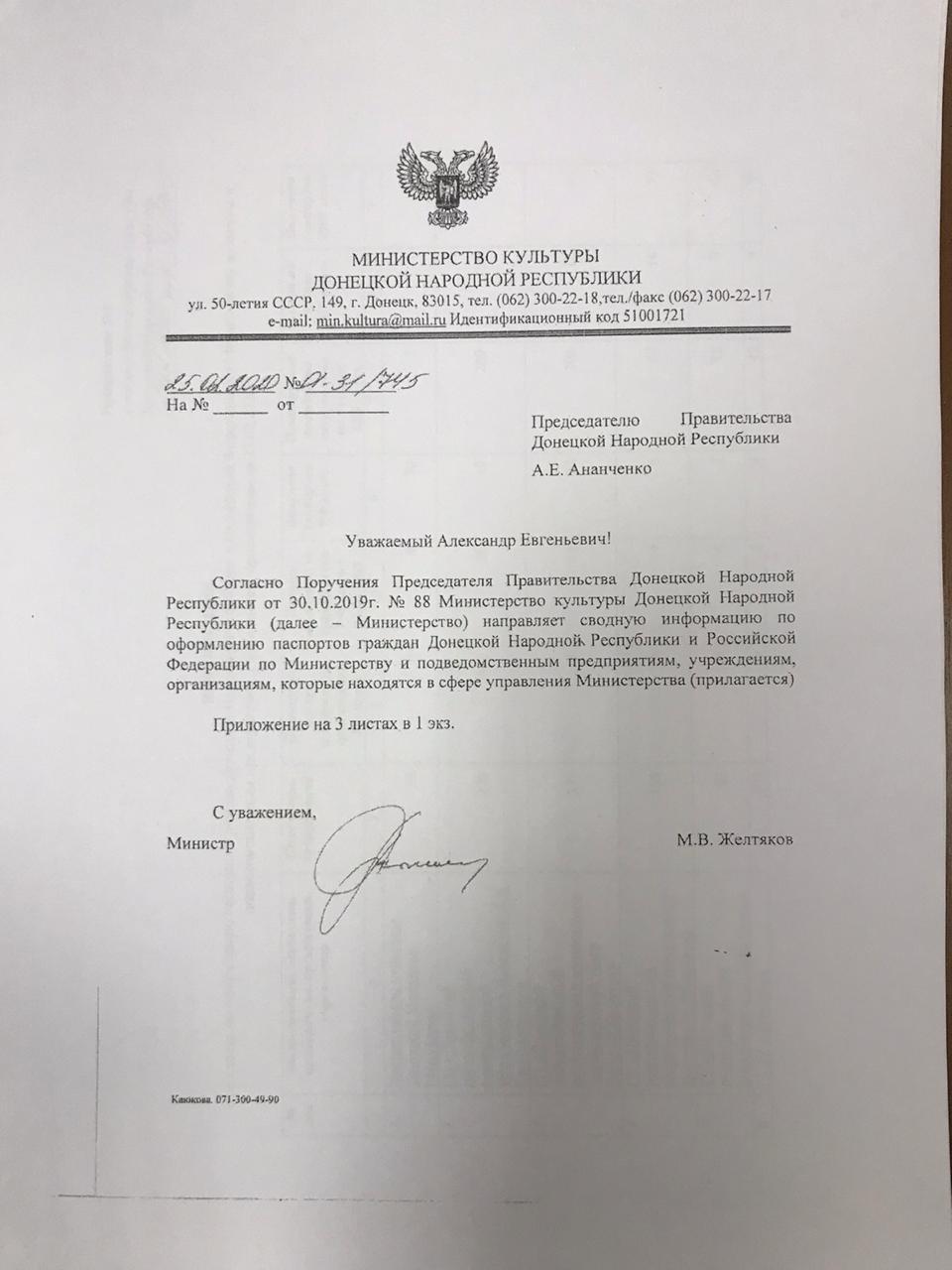 Найвищий рівень паспортизації спостерігається в апараті "міністерства": на 38 співробітників припадає 30 паспортів РФ і стільки ж "паспортів" "ДНР". З урахуванням поданих заяв, співробітники "Мінкульту" поголовно будуть забезпечені як незаконно виданими російськими, так і фейковими "республіканськими" документами.