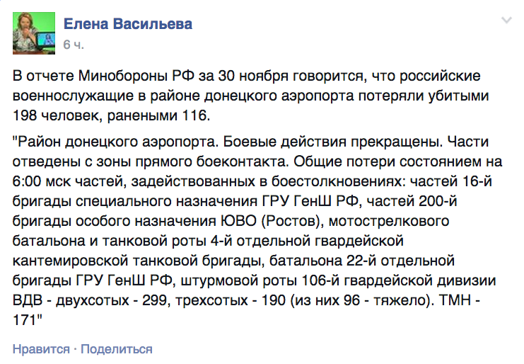 У звіті Міноборони Росії за 30 листопада йдеться, що російські військовослужбовці в районі Донецького аеропорту втратили вбитими 299 чоловік, пораненими - 190. Про це на своїй сторінці у Facebook повідомила російська правозахисниця Олена Васильєва.