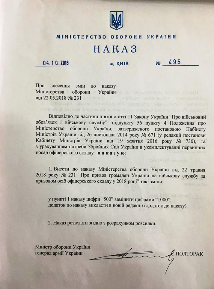 Міністерство оборони України 4 жовтня внесло зміни в наказ "Про призов громадян України на військову службу за призовом осіб офіцерського складу в 2018 році". Згідно з цим наказом, передбачено збільшення офіцерів запасу для призову в 2018 році з 500 до 1000 осіб. Призов офіцерів запасу стартує в листопаді 2018 року.