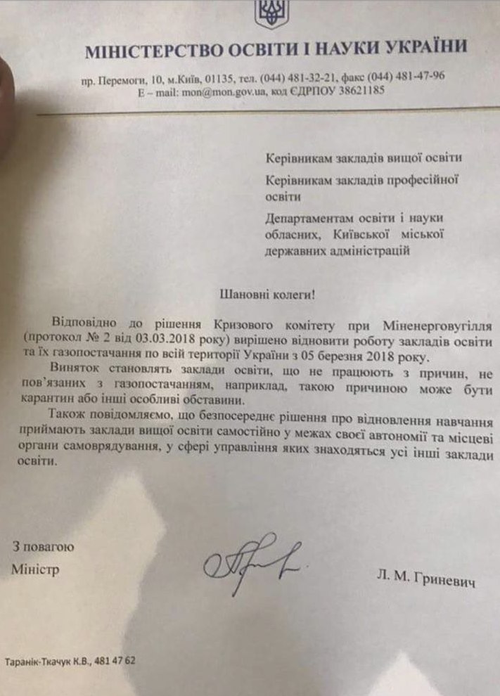 "Зараз проблему з газопостачанням в країні вдалося оперативно вирішити, тому вже в понеділок, 5 березня, всі навчальні заклади - дитячі садочки, школи, ПТУ та виші - працюють в звичайному режимі", - йдеться в повідомленні.